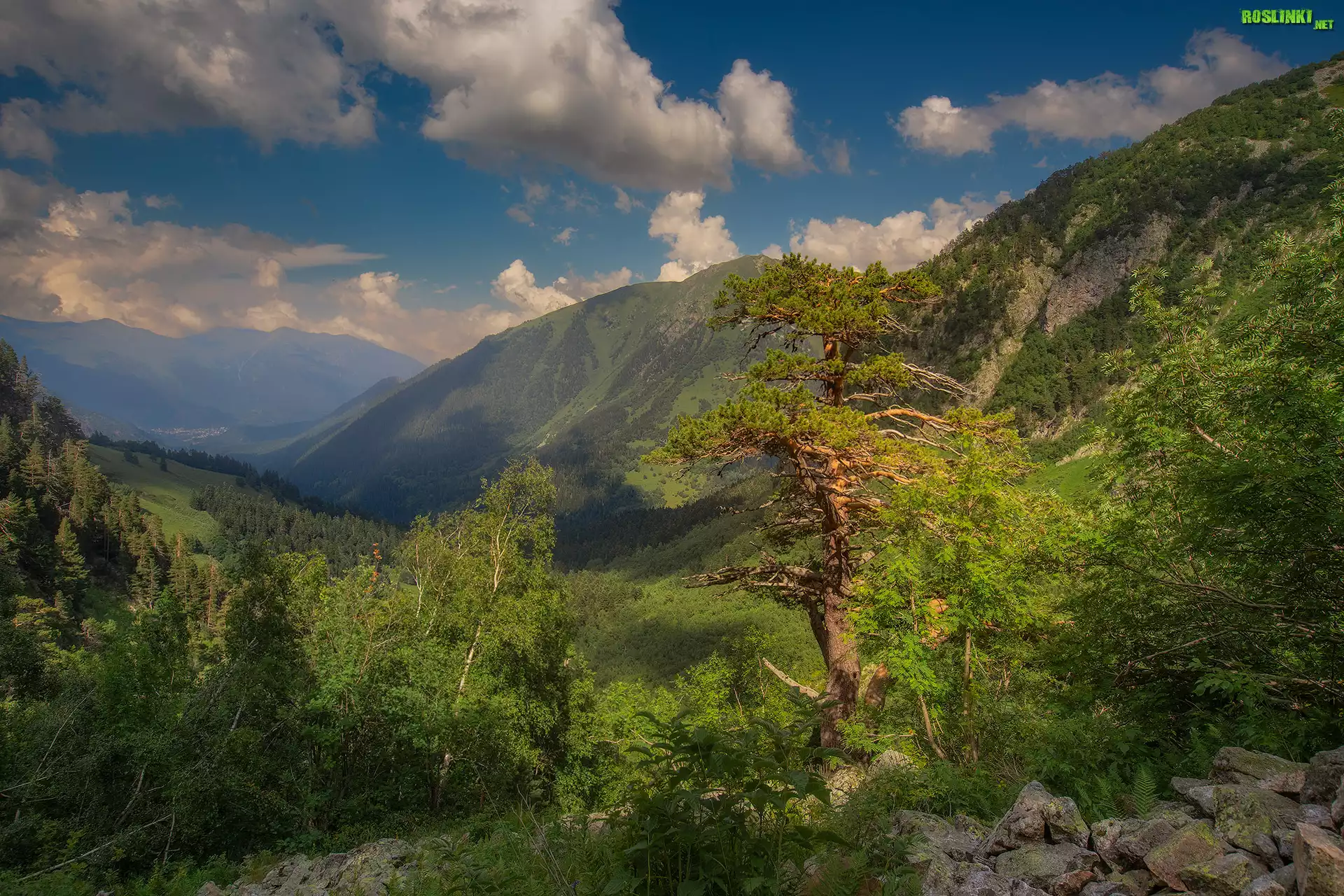 Rośliny: Góry, Las, Drzewa, Kamienie, Dolina, Zachód słońca, Chmury