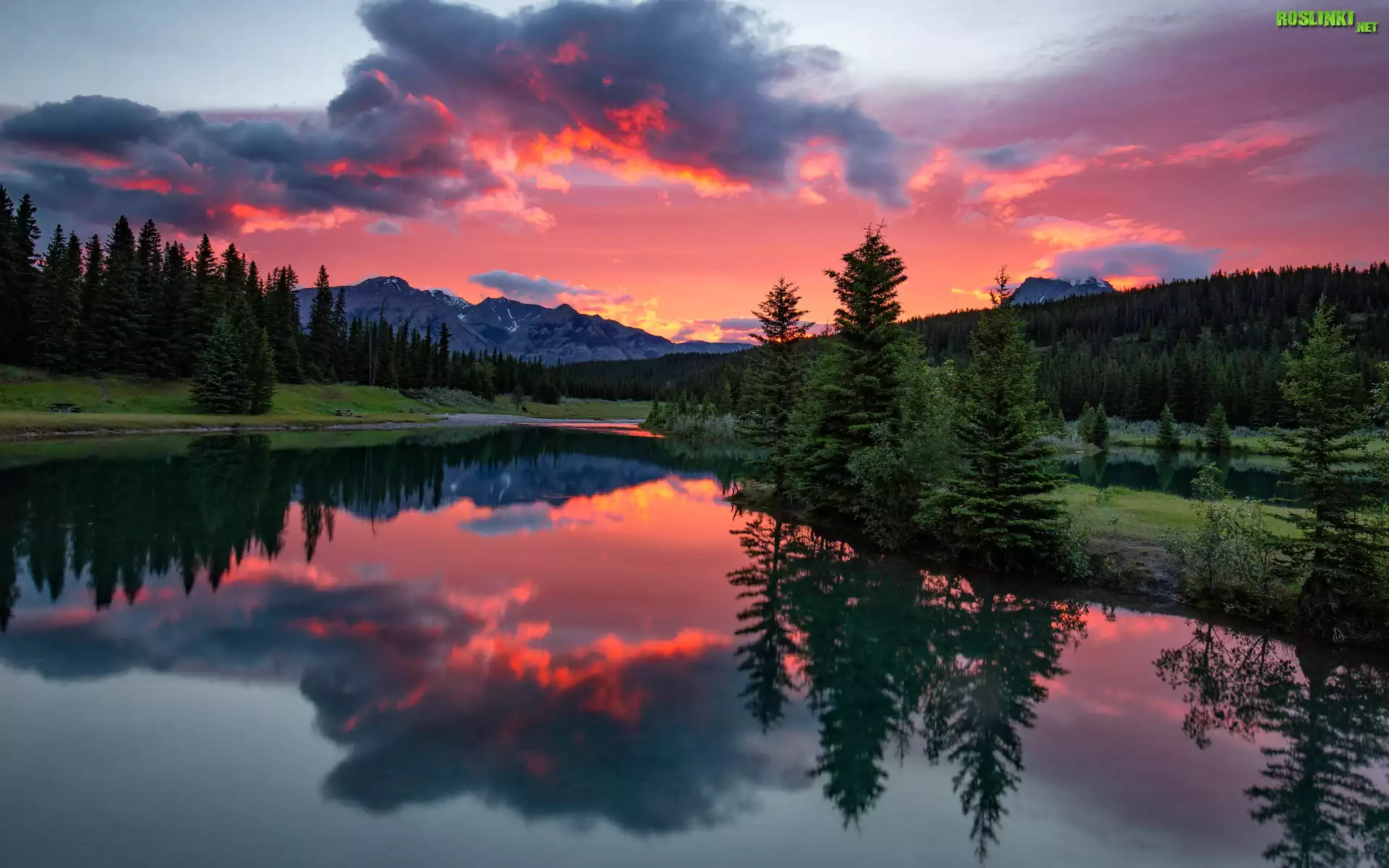 Rośliny: Kanada, Alberta, Park Narodowy Banff, Jezioro, Las, Drzewa, Góry, Niebo, Zachód słońca, Chmury