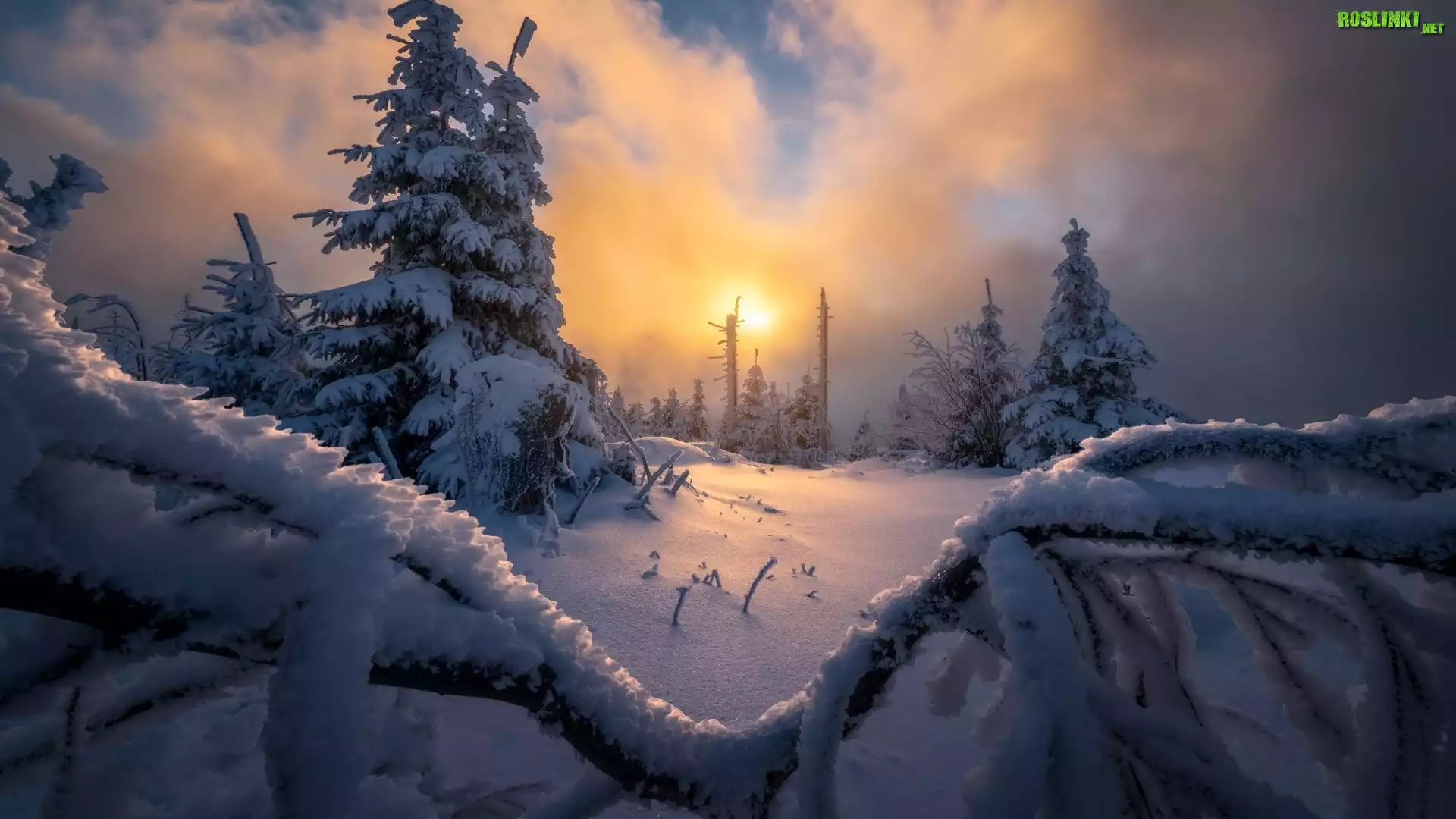 Rośliny: Zima, Ośnieżone, Drzewa, Skały, Wschód słońca, Mgła, Chmury