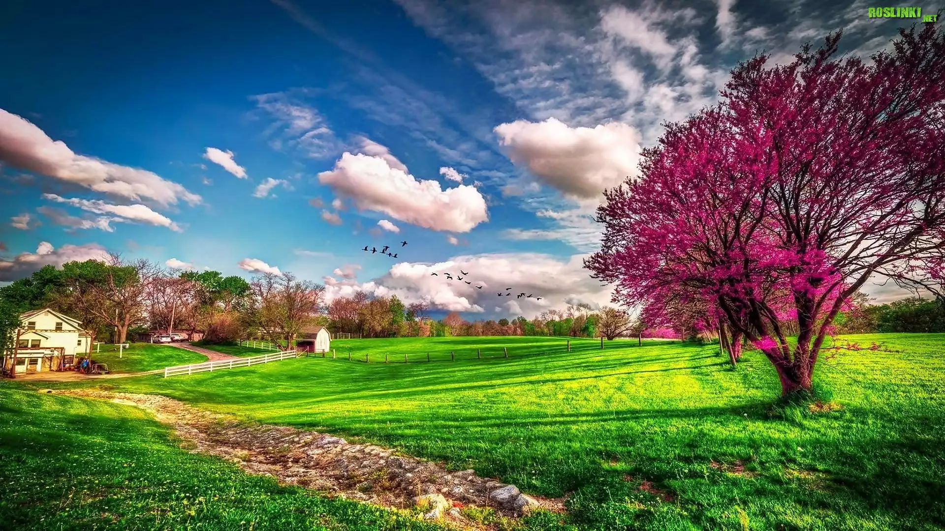 Rośliny: Łąki, Drzewo, Chmury, Ptaki