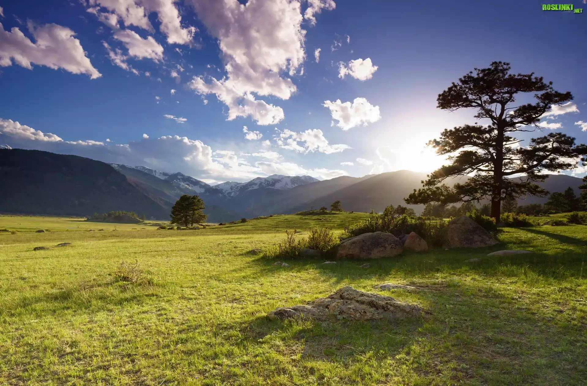 Rośliny: Chmury, Góry, Drzewo, Kamienie