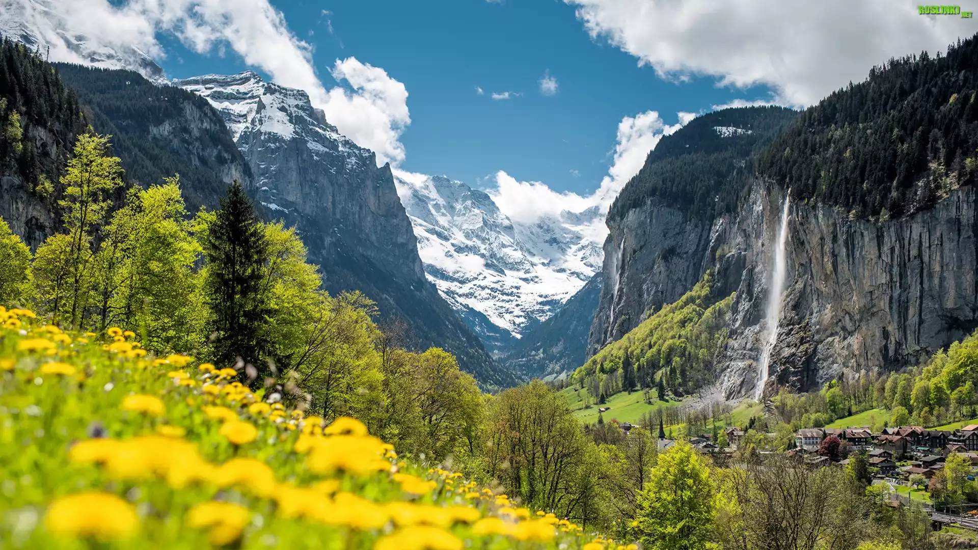 Góry, Alpy, Kwiaty, Drzewa, Chmury, Domy, Dolina Lauterbrunnental, Wodospad, Staubbachfall, Lauterbrunnen, Kanton Bern, Szwajcaria |