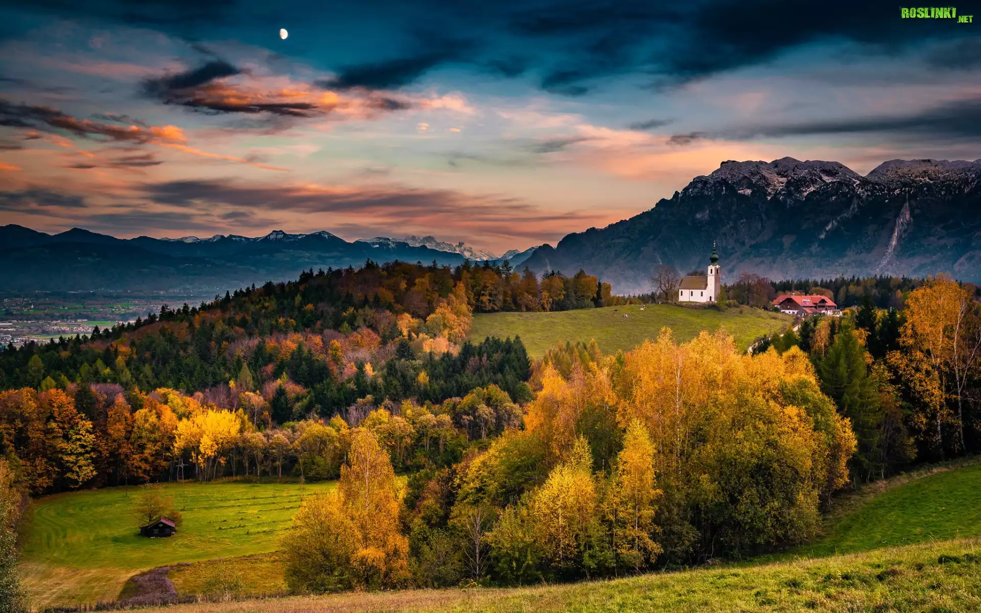 Niemcy, Bawaria, Alpy, Berchtesgaden, Jesień, Las, Góry, Drzewa, Polana, Dom, Wzgórze, Kościół, Niebo, Chmury, Księżyc, Wieczór |