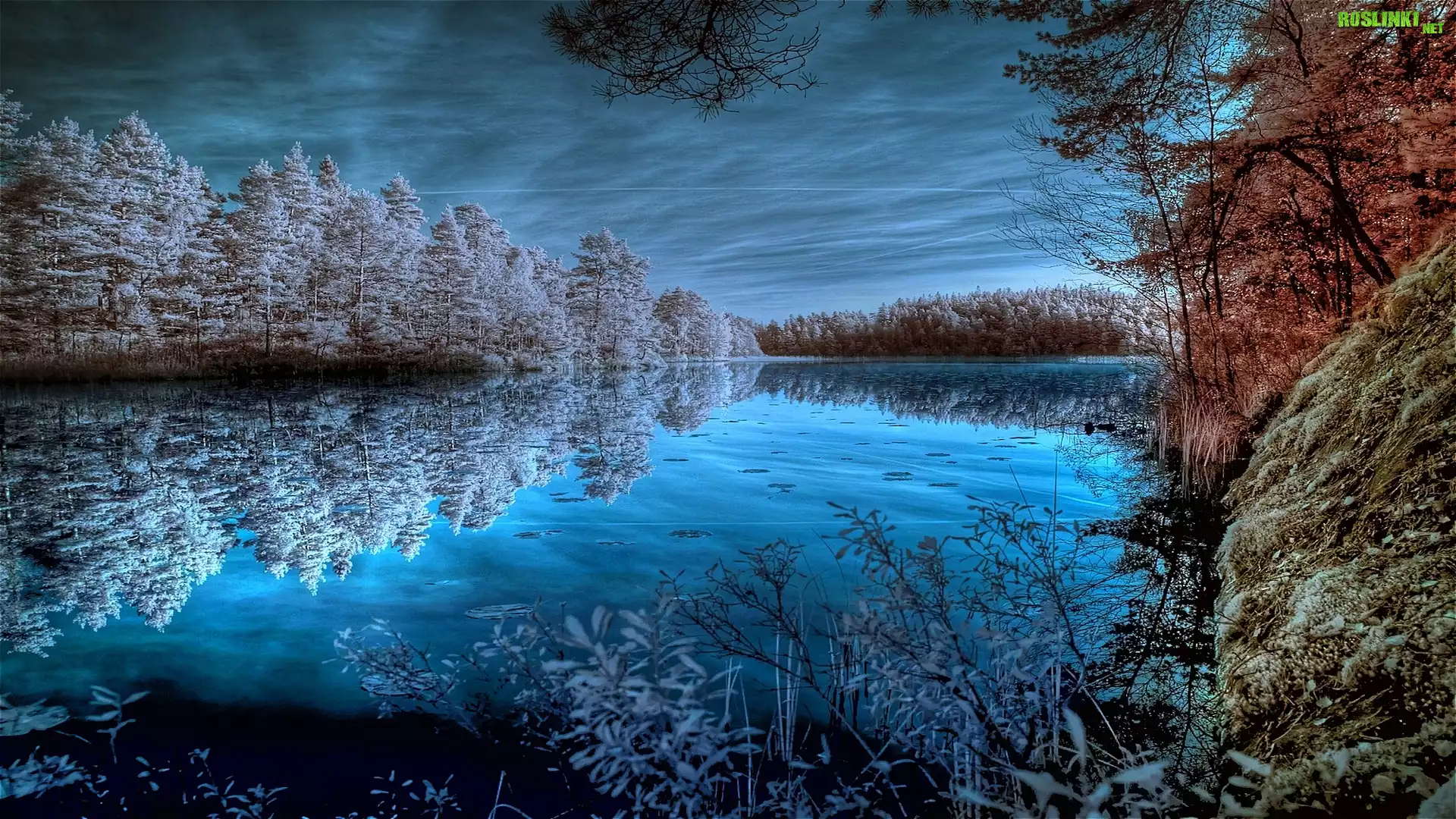 Rośliny: Chmury, Drzewa, Jezioro, Odbicie
