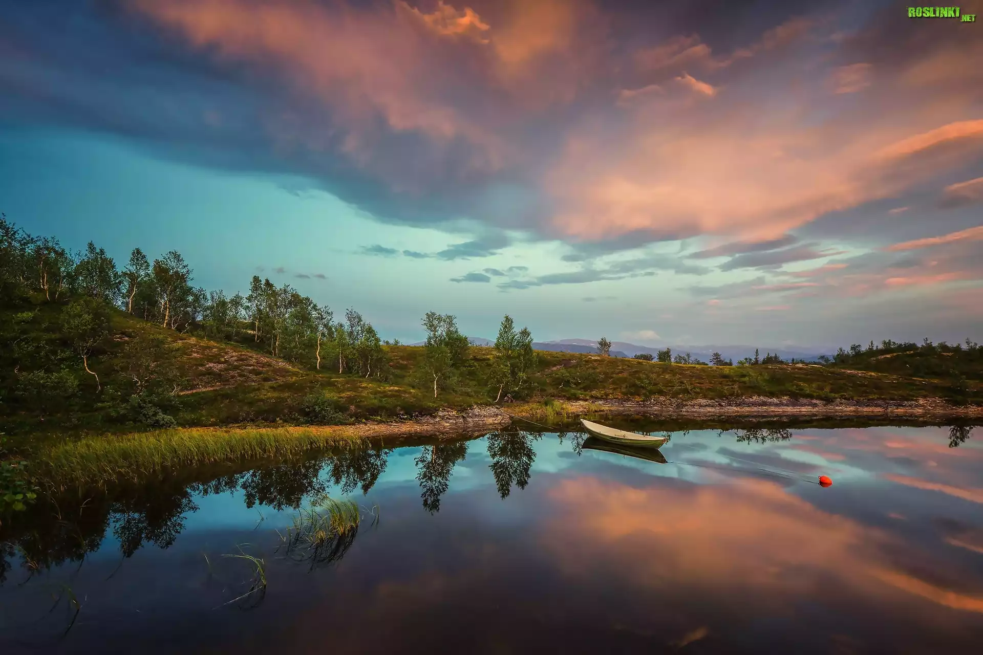 Rośliny: Chmury, Wzgórza, Drzewa, Jezioro, Łódka