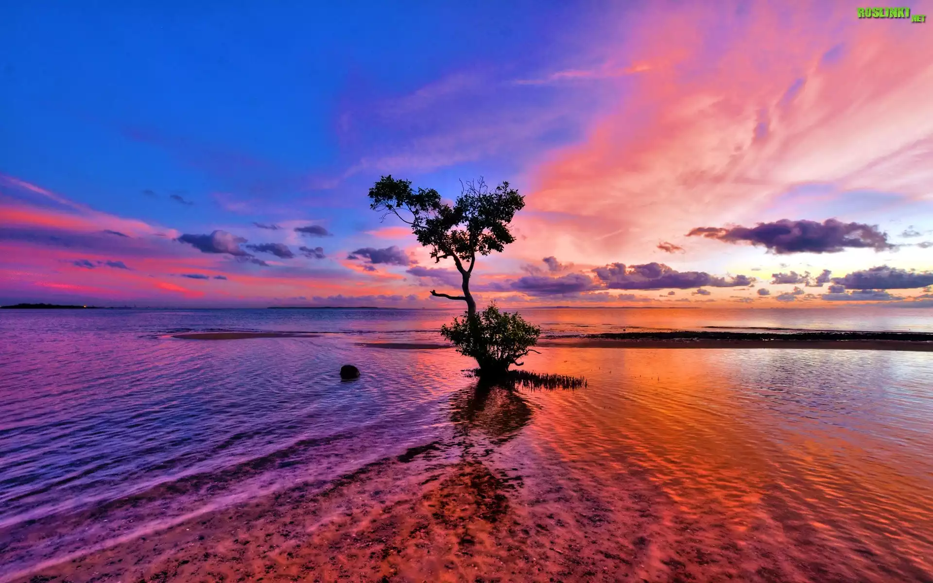 Chmury, Zachód, Słońca, Jezioro, Drzewo