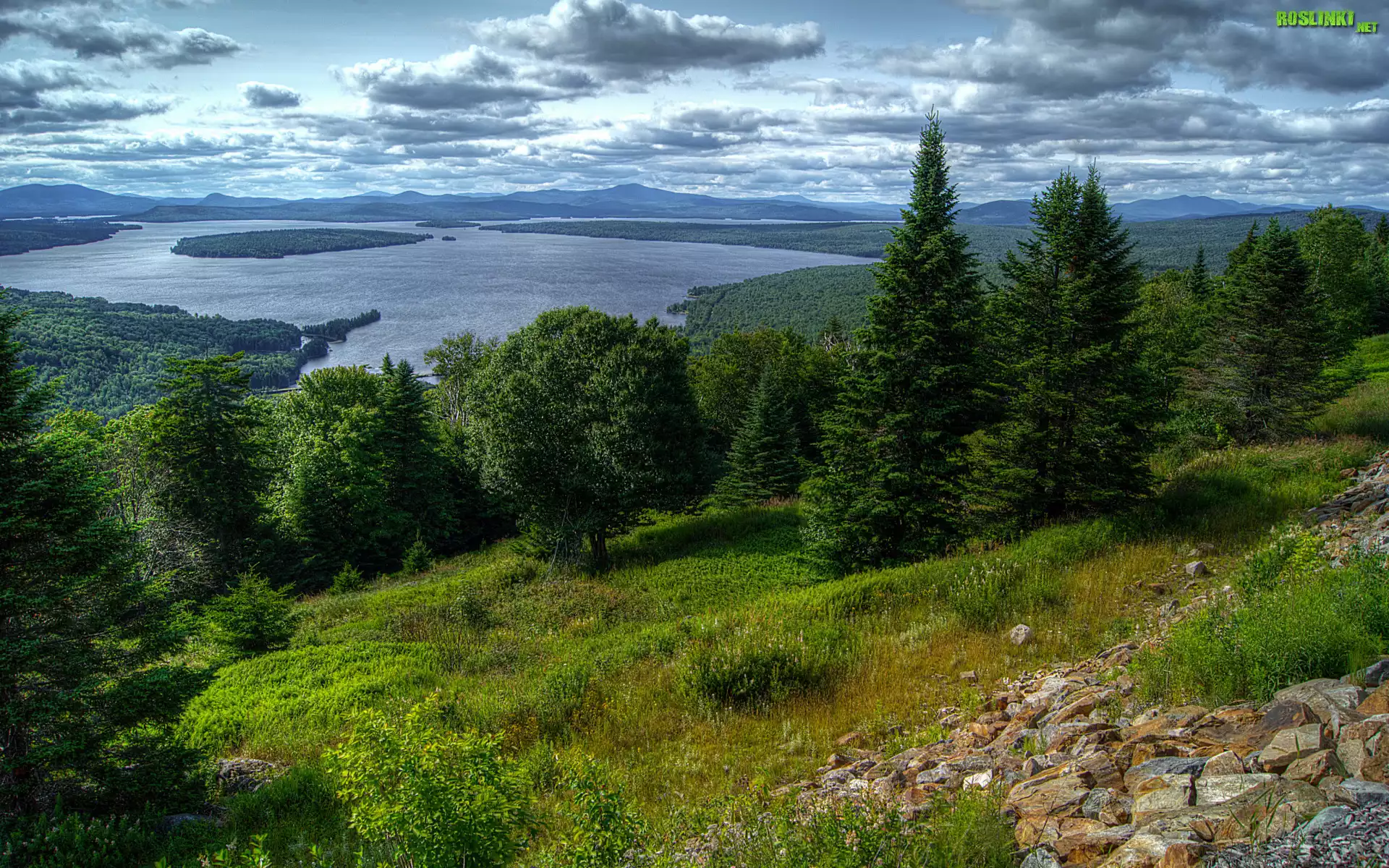 Chmury, Las, Drzewa, Kamienie, Stok, Rośliny, Jezioro, Mooselookmeguntic Lake, Stan Maine, Stany Zjednoczone |