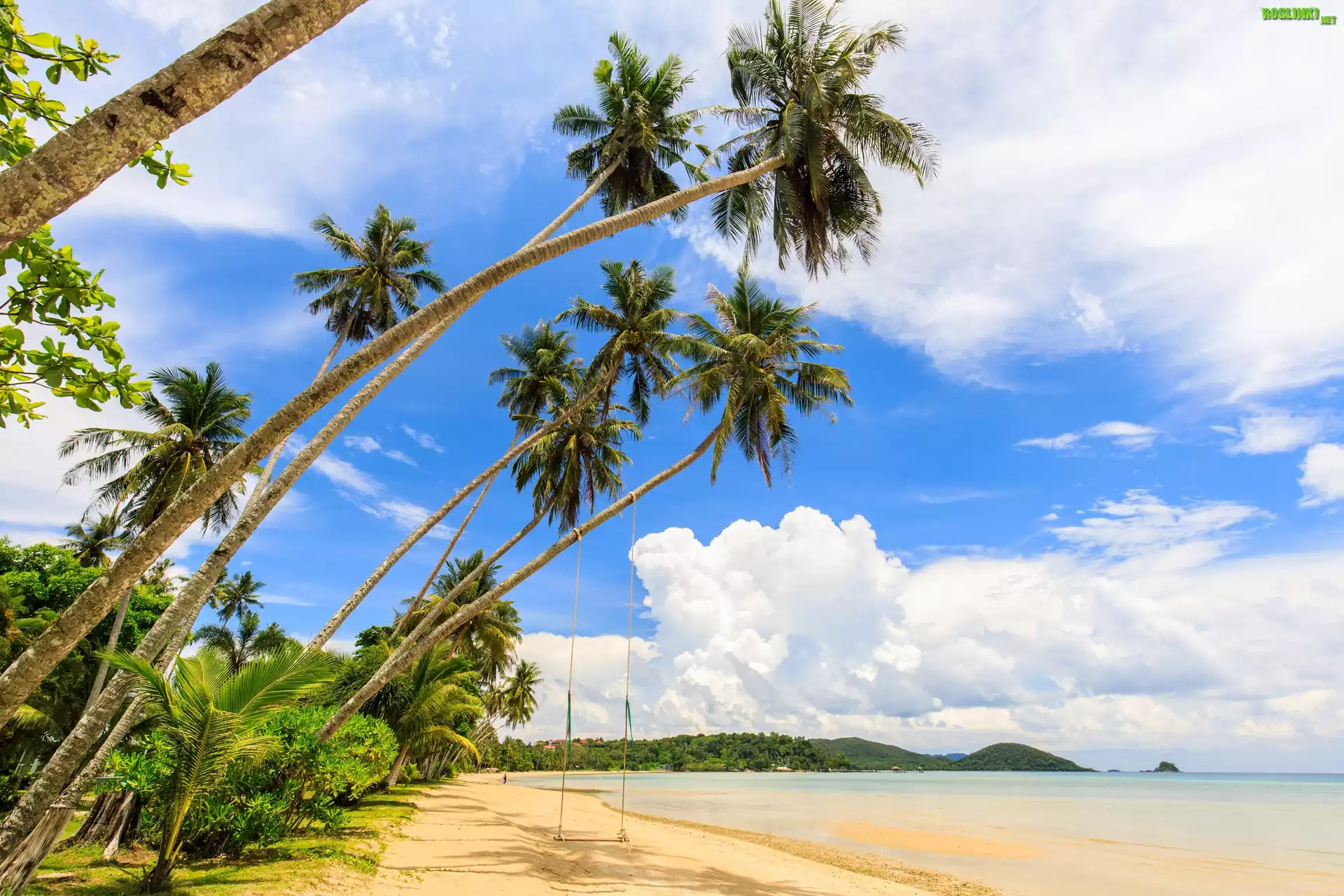 Rośliny: Morze, Palmy, Plaża, Wyspa Ko Mak, Prowincja Trat, Tajlandia, Chmury