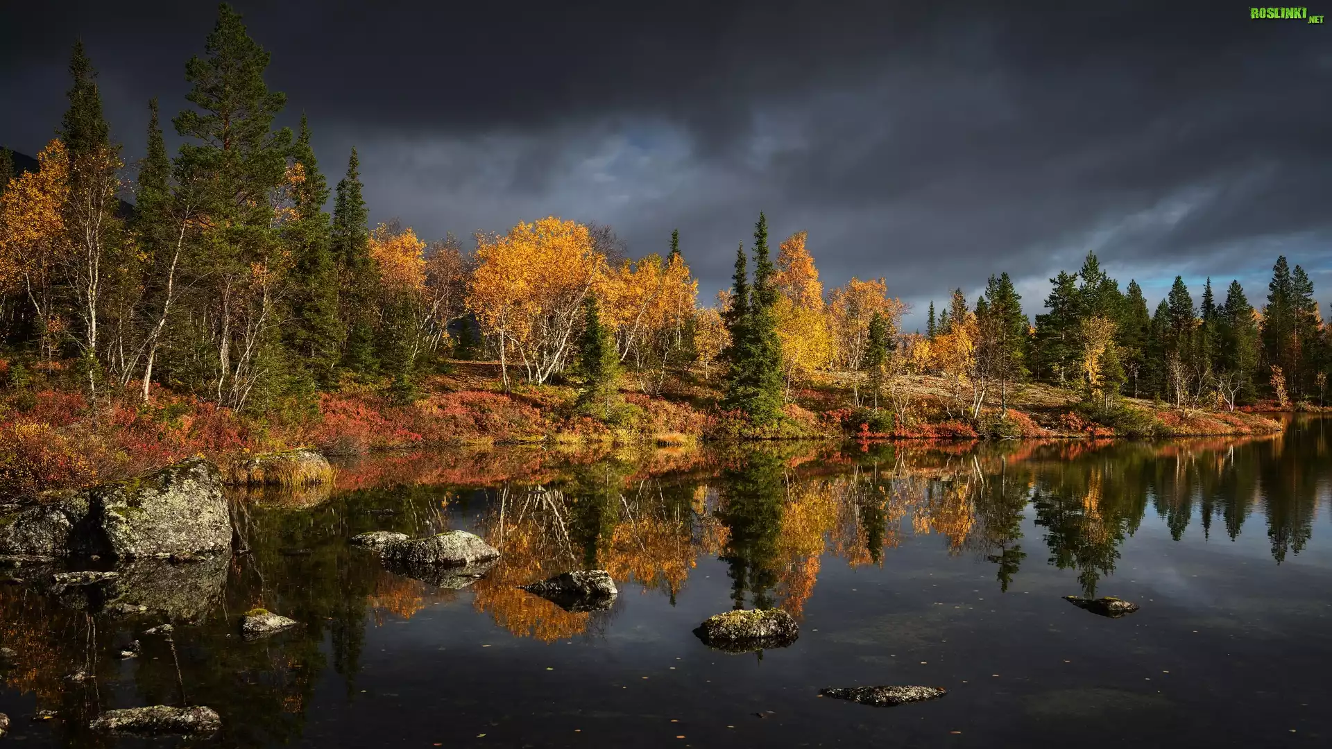 Rośliny: Rosja, Półwysep Kolski, Chibiny, Jezioro, Jesień, Drzewa, Chmury