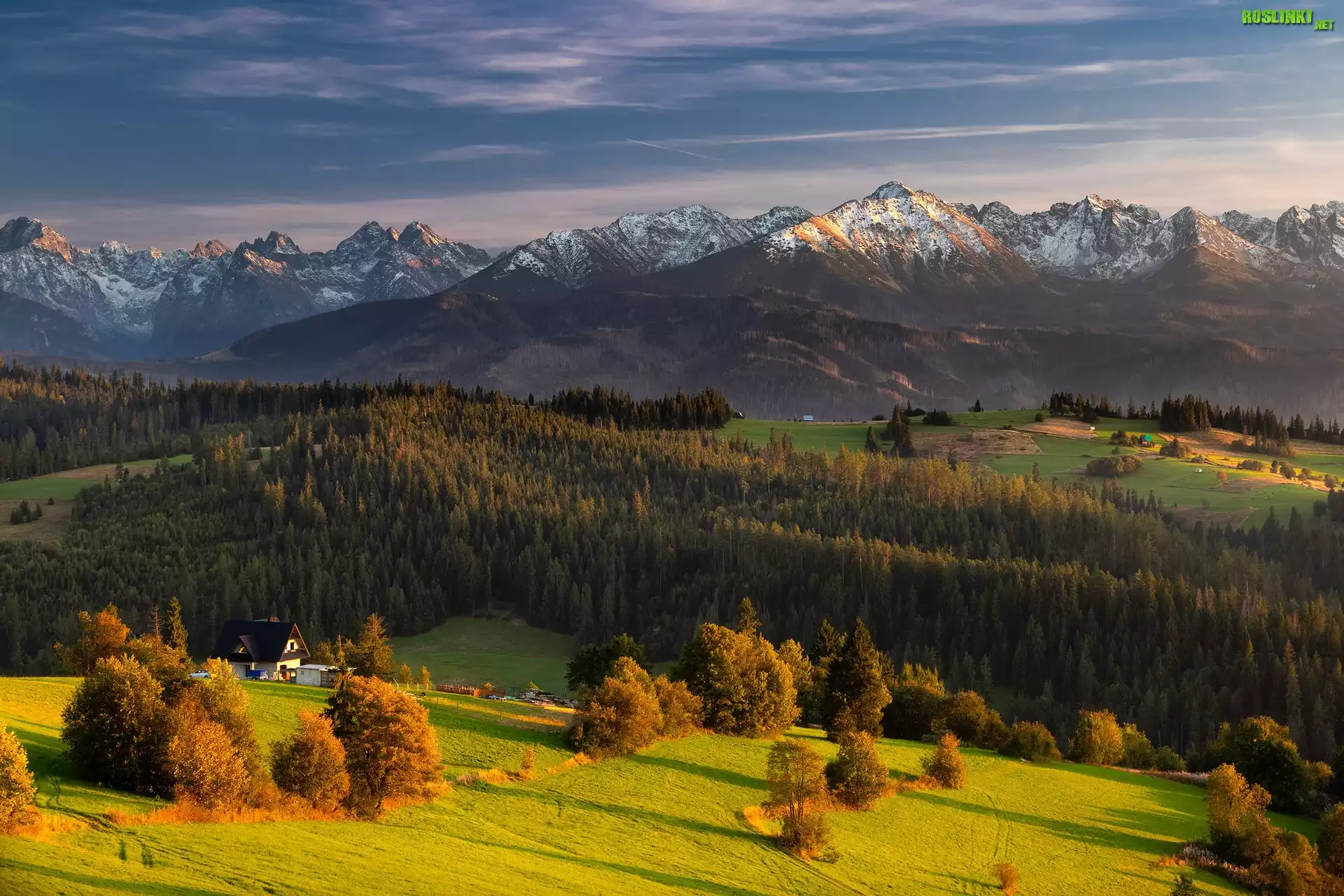 Rośliny: Jesień, Góry, Las, Drzewa, Dolina, Dom, Polana, Chmury