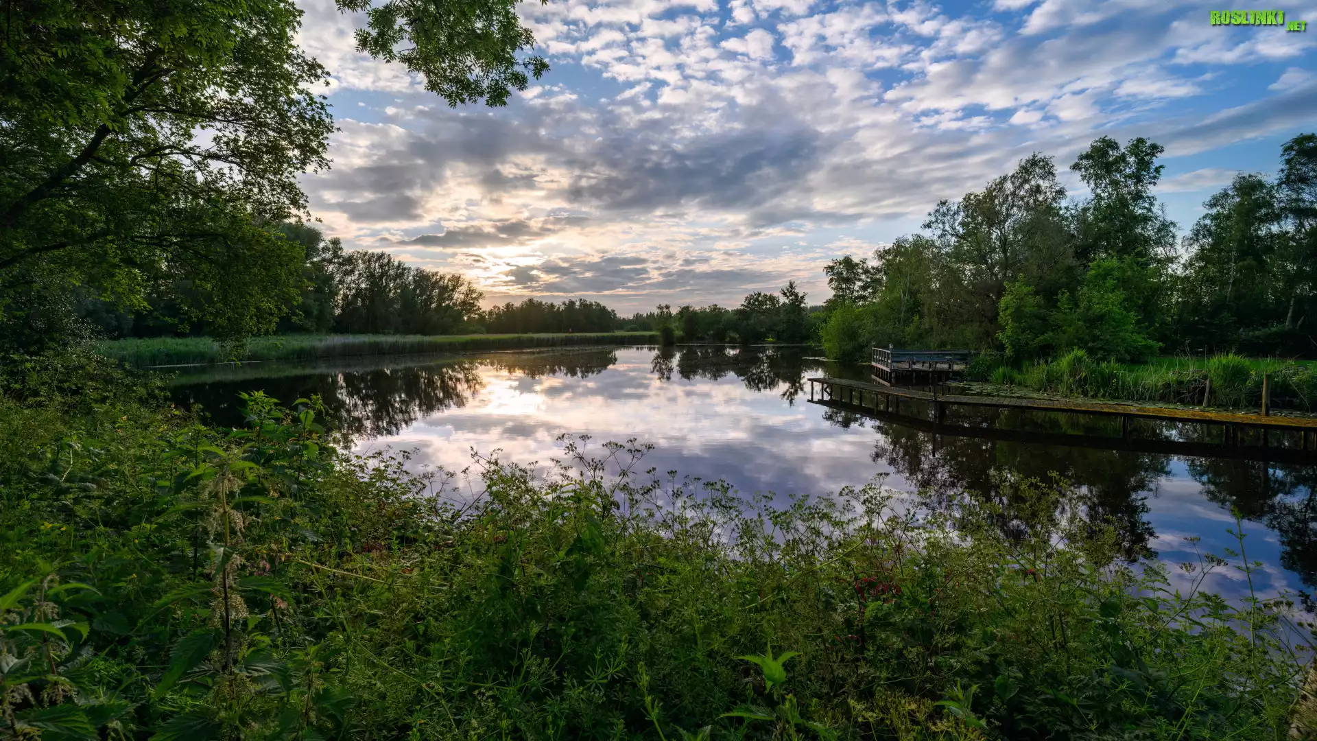 Rośliny: Rzeka, Pomost, Drzewa, Chmury, Odbicie, Lato