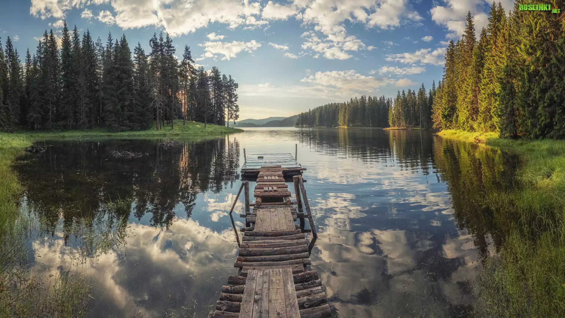 Rośliny: Jezioro, Drewniany, Pomost, Drzewa, Odbicie, Las, Niebo, Chmury