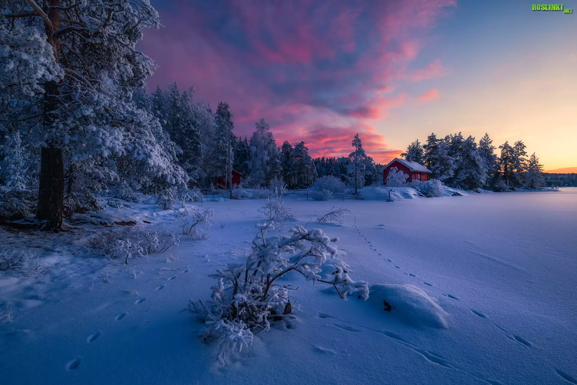 Rośliny: Norwegia, Gmina Ringerike, Zima, Drzewa, Domek, Zachód słońca, Chmury