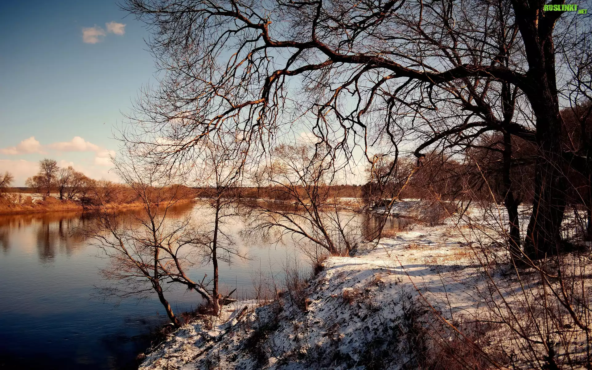 Rośliny: Rzeka, Drzewa, Śnieg, Chmury