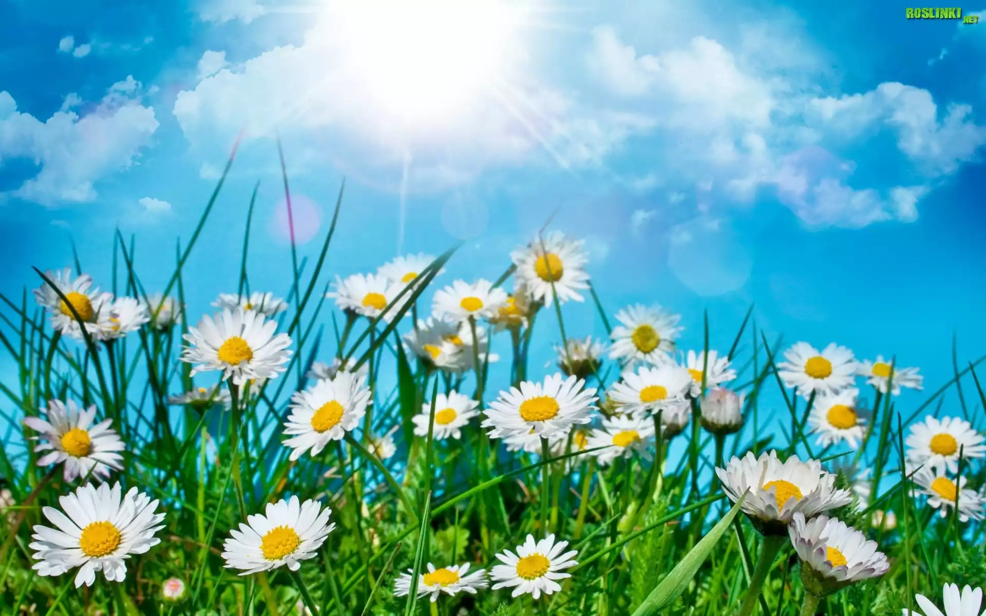 Rośliny: Łąka, Stokrotki, Trawa, Chmury, Słońce