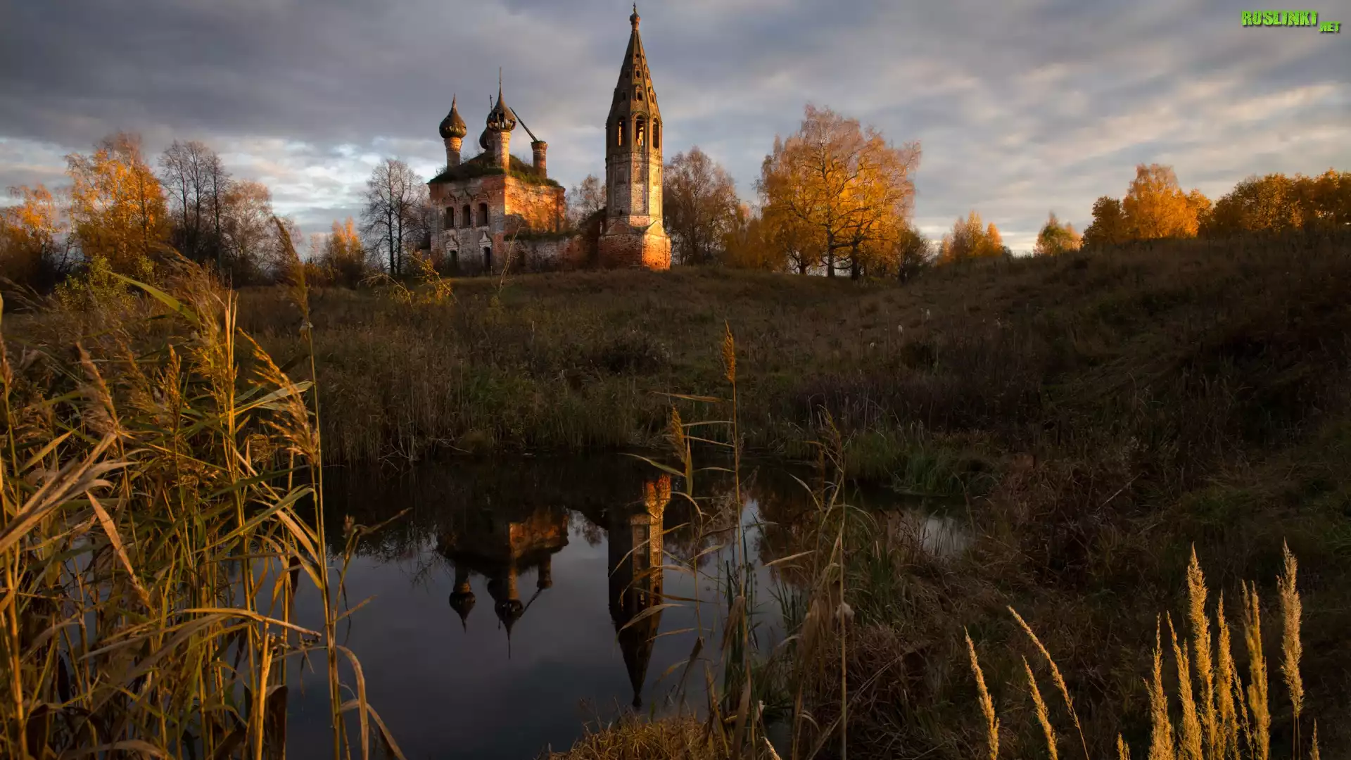 Rośliny: Jesień, Szuwary, Trawa, Wzgórze, Cerkiew, Pożółkłe, Drzewa, Chmury