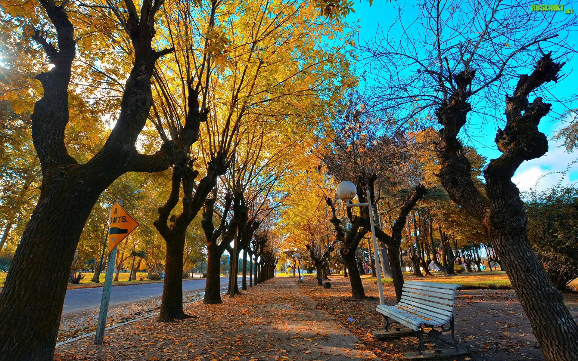 Rośliny: Jesień, Chodnik, Drzewa, Pożółkłe, Liście, Ławka, Latarnie