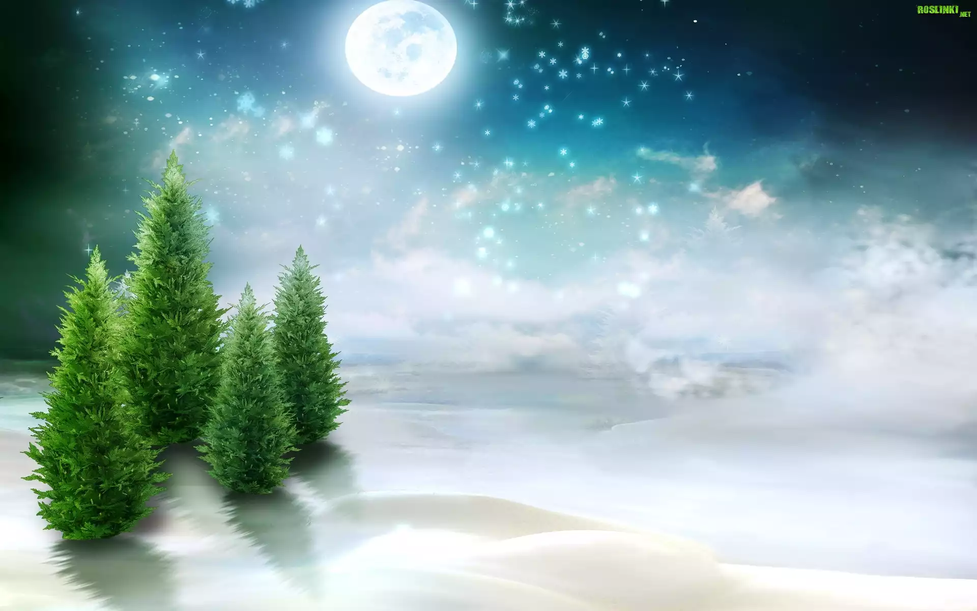 Rośliny: Choinki, Śnieg, Księżyc, Zima