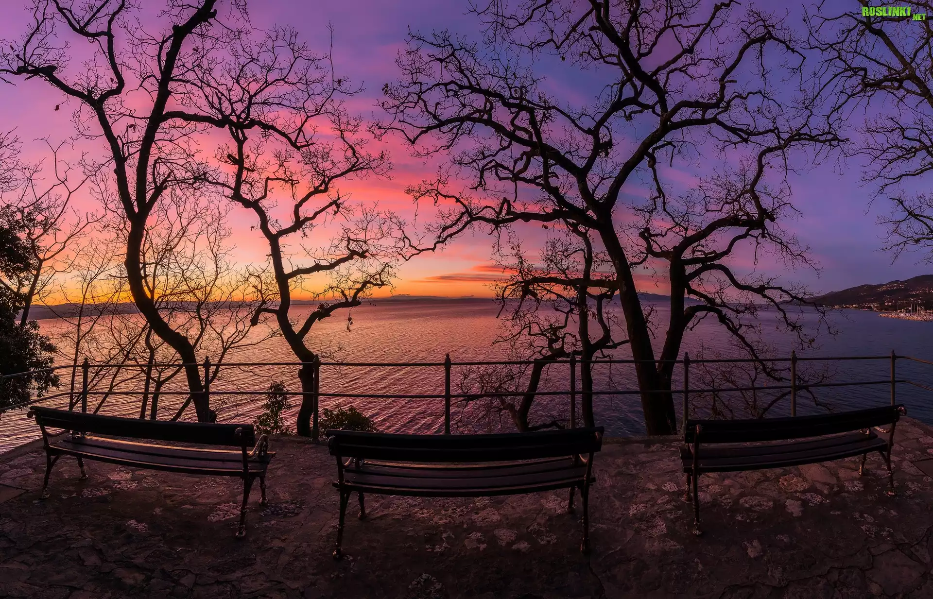 Rośliny: Jezioro, Zatoka Kvarner, Drzewa, Ławki, Zachód słońca, Opatija, Chorwacja