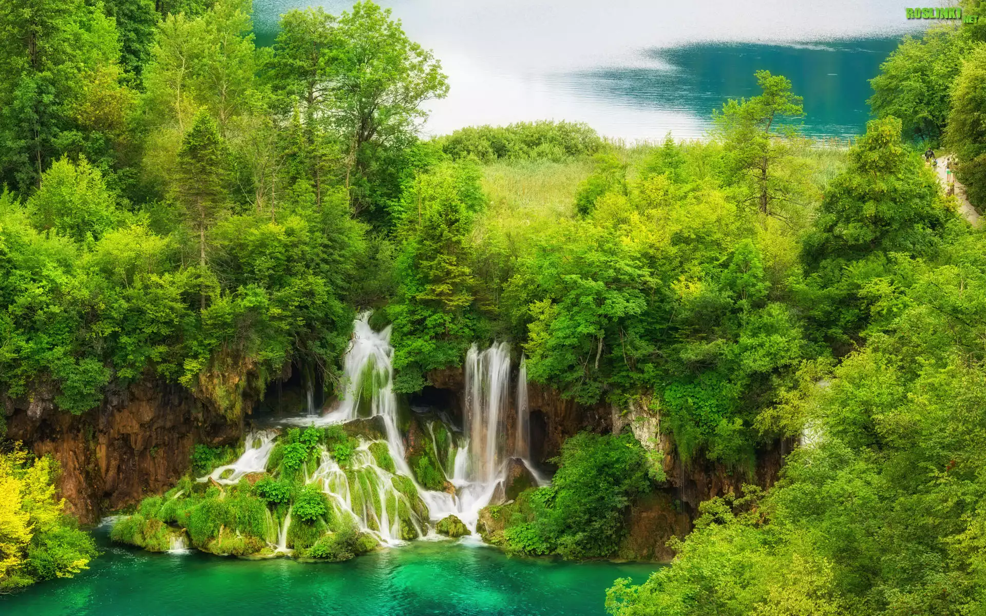 Wodospady, Jeziora, Drzewa, Rośliny, Skały, Park Narodowy Jezior Plitwickich, Chorwacja