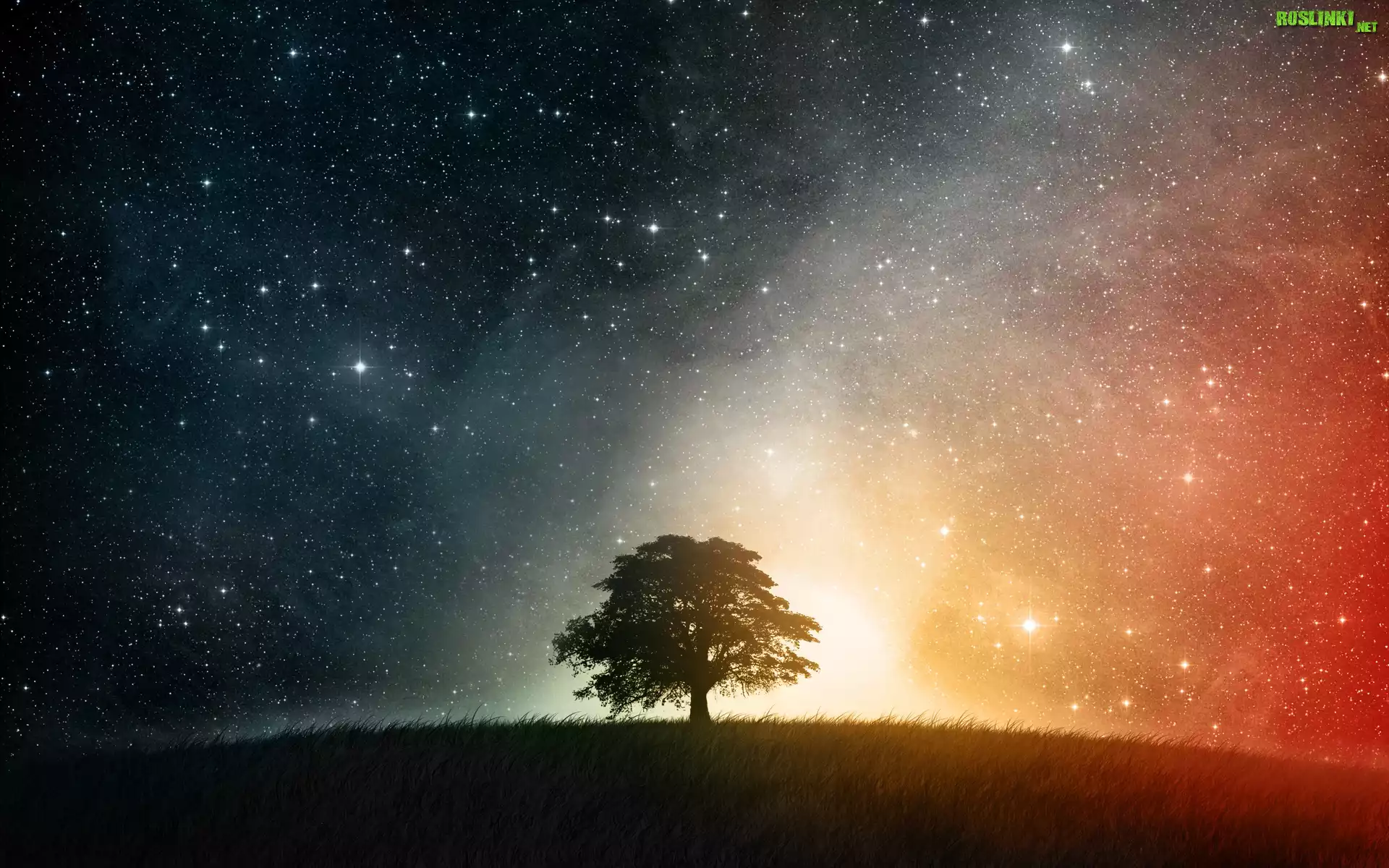 Rośliny: Ciemne, Niebo, Miliony, Gwiazd, Trawa, Drzewko