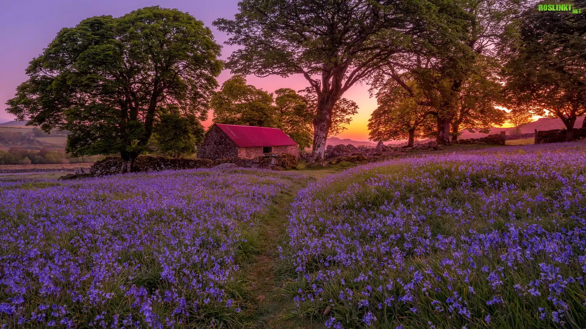 Łąka, Ścieżka, Kwiaty, Dzwonki, Drzewa, Dom, Murek, Zachód słońca, Wiosna