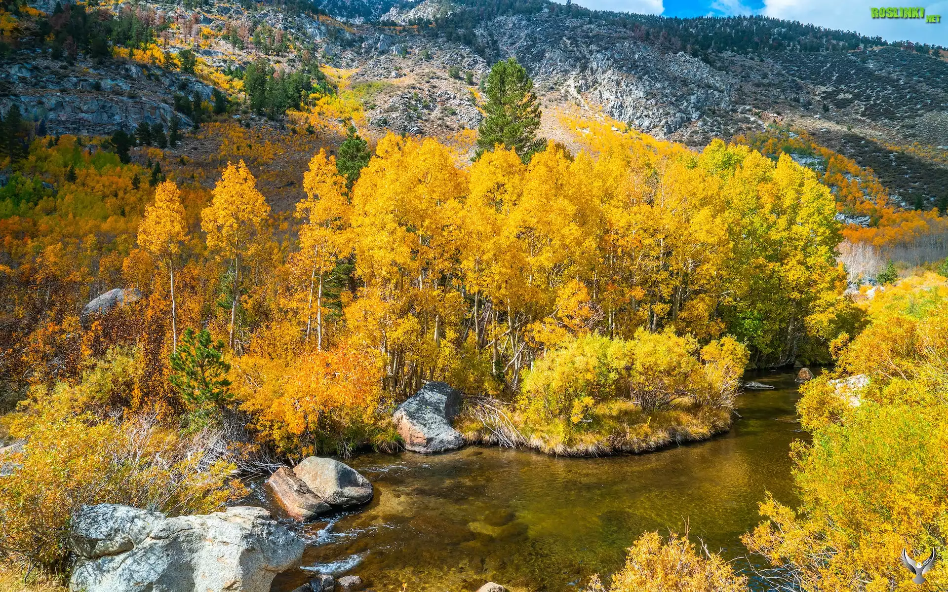 Rośliny: Rzeka, Bishop Creek, Jesień, Krzewy, Pożółkłe, Drzewa, Góry, Kalifornia, Stany Zjednoczone