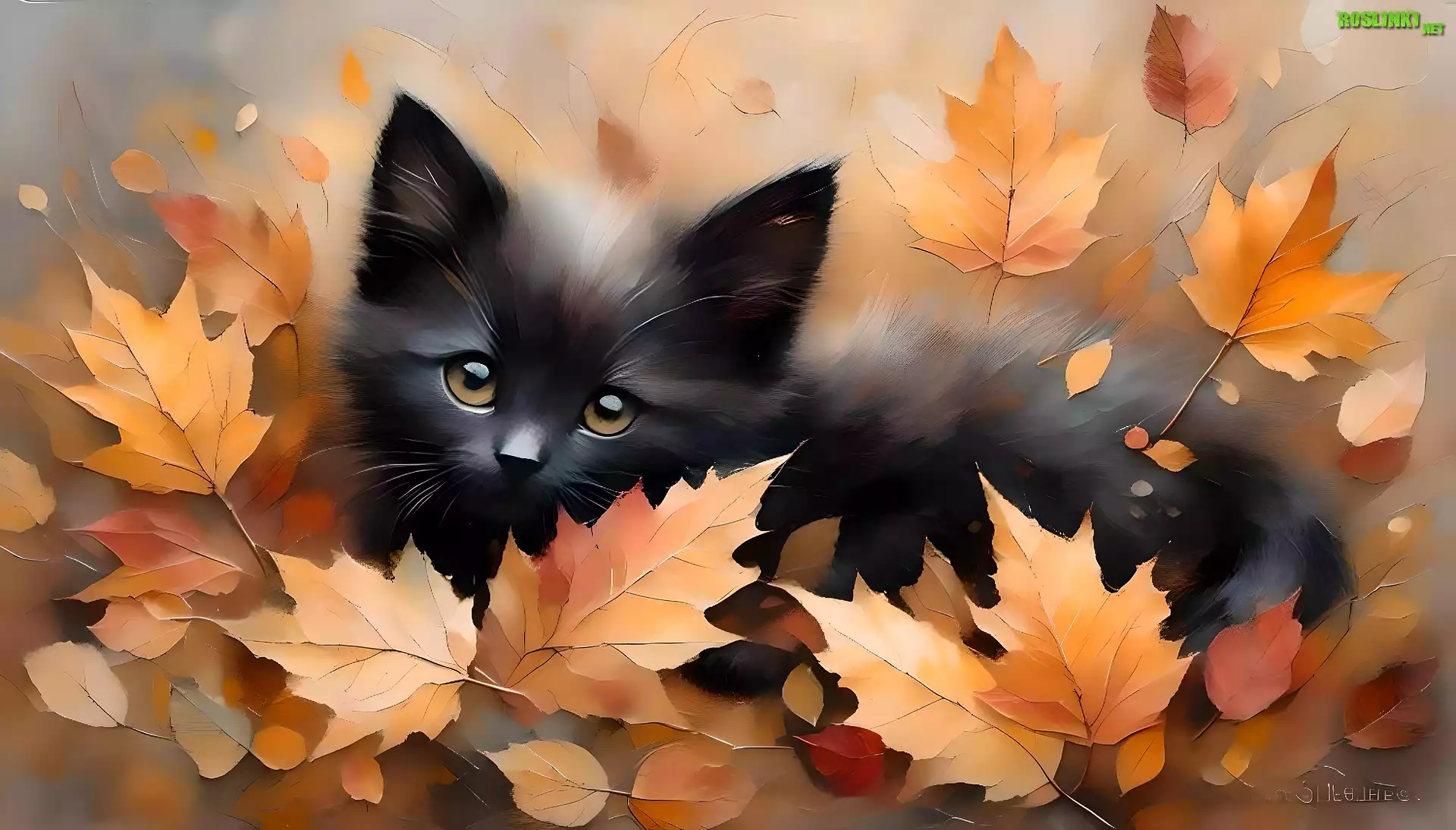 Jesień, Czarny, Kot, Liście, Grafika