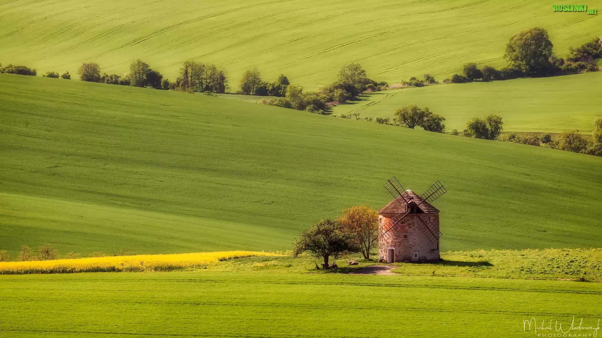 Rośliny: Pola uprawne, Wzgórza, Wiatrak, Drzewa, Gmina Kunkovice, Kraj południowomorawski, Czechy