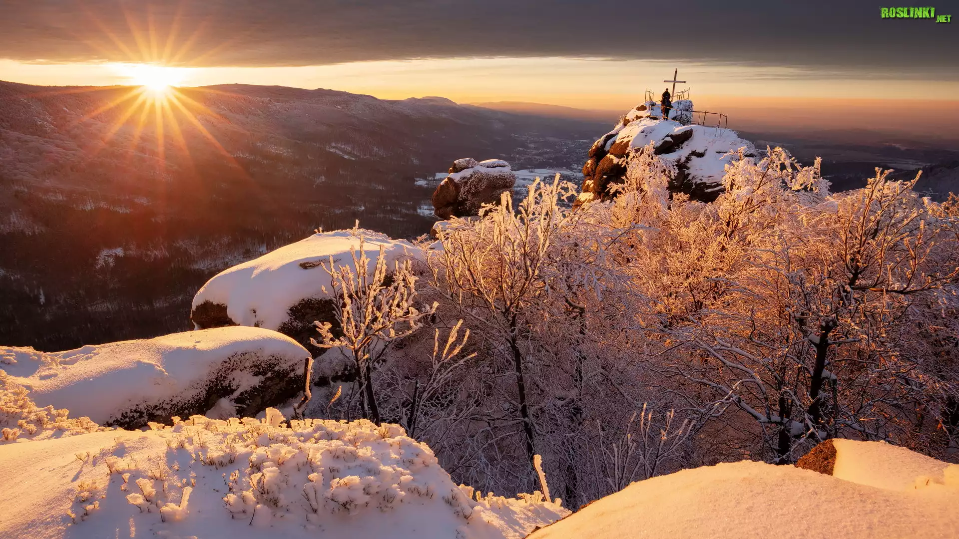 Rośliny: Zima, Góry Izerskie, Skały, Ośnieżone, Drzewa, Promienie słońca, Czechy