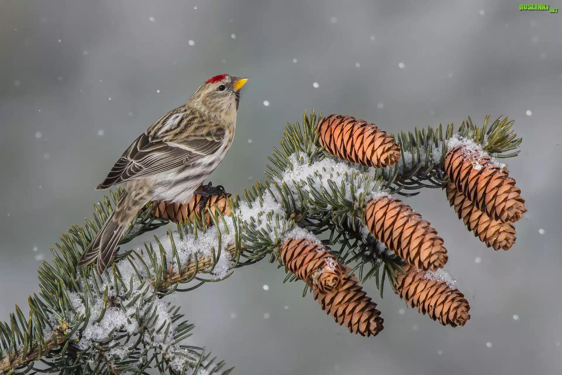 Ptak, Czeczotka zwyczajna, Gałązka, Świerk, Szyszki, Śnieg