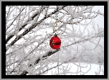 Drzewo, Oszronione, Śnieg, Czerwona, Bombka, Boże Narodzenie