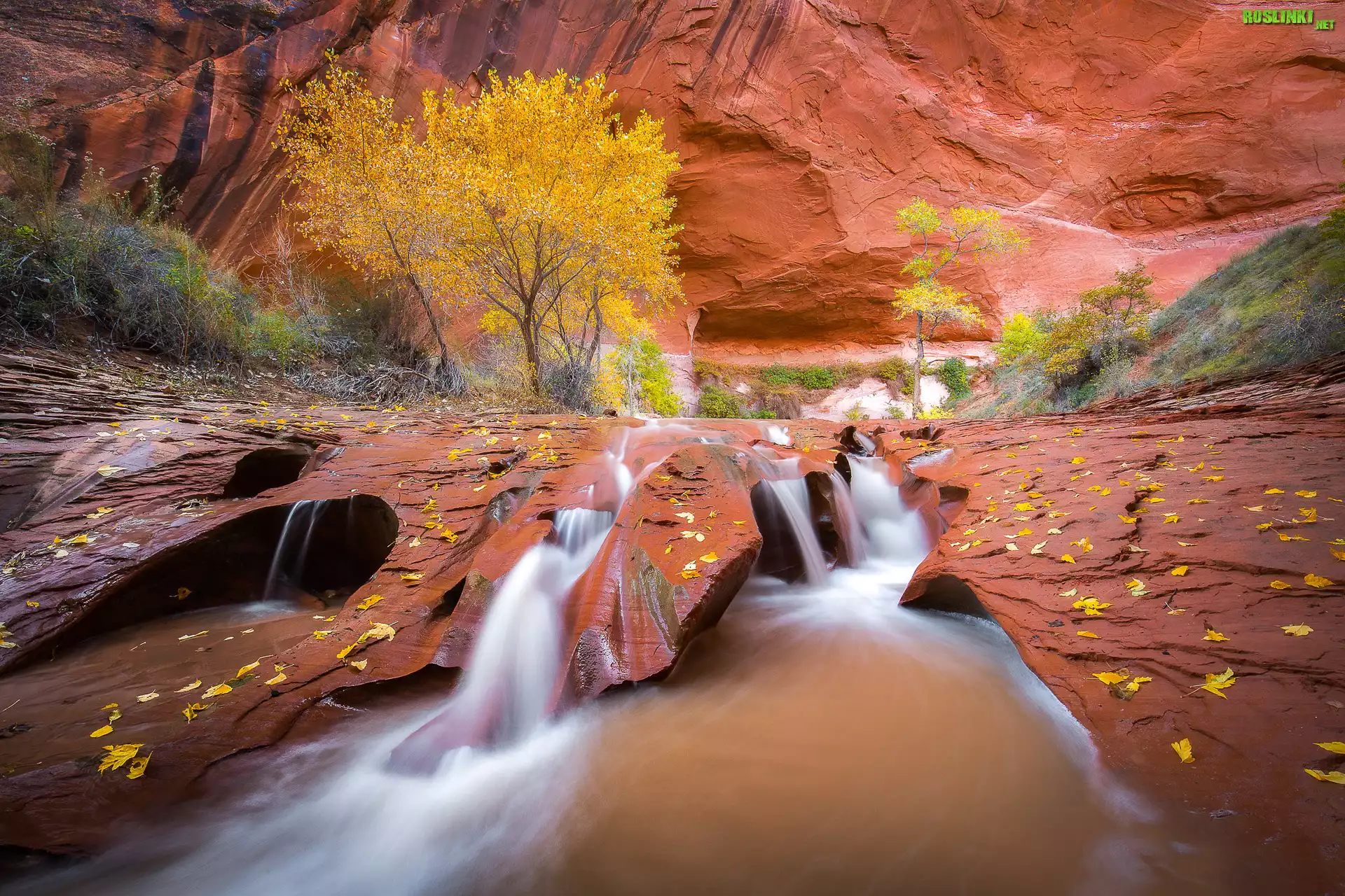 Rzeka Coyote Gulch, Wąwóz, Czerwone, Skały, Drzewa, Roślinność, Liście, Jesień, Stan Utah, Stany Zjednoczone |