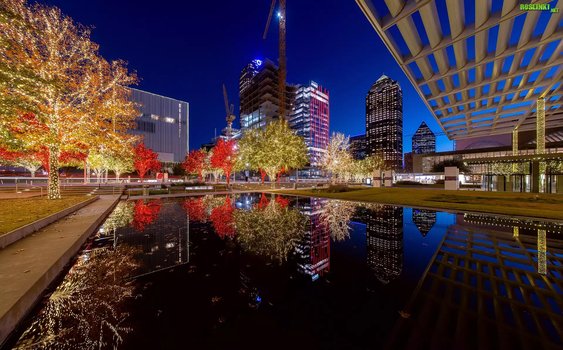 Rośliny: Miasto nocą, Dallas, Teksas, Stany Zjednoczone, Wieżowce, Sadzawka, Oświetlone, Drzewa, Noc