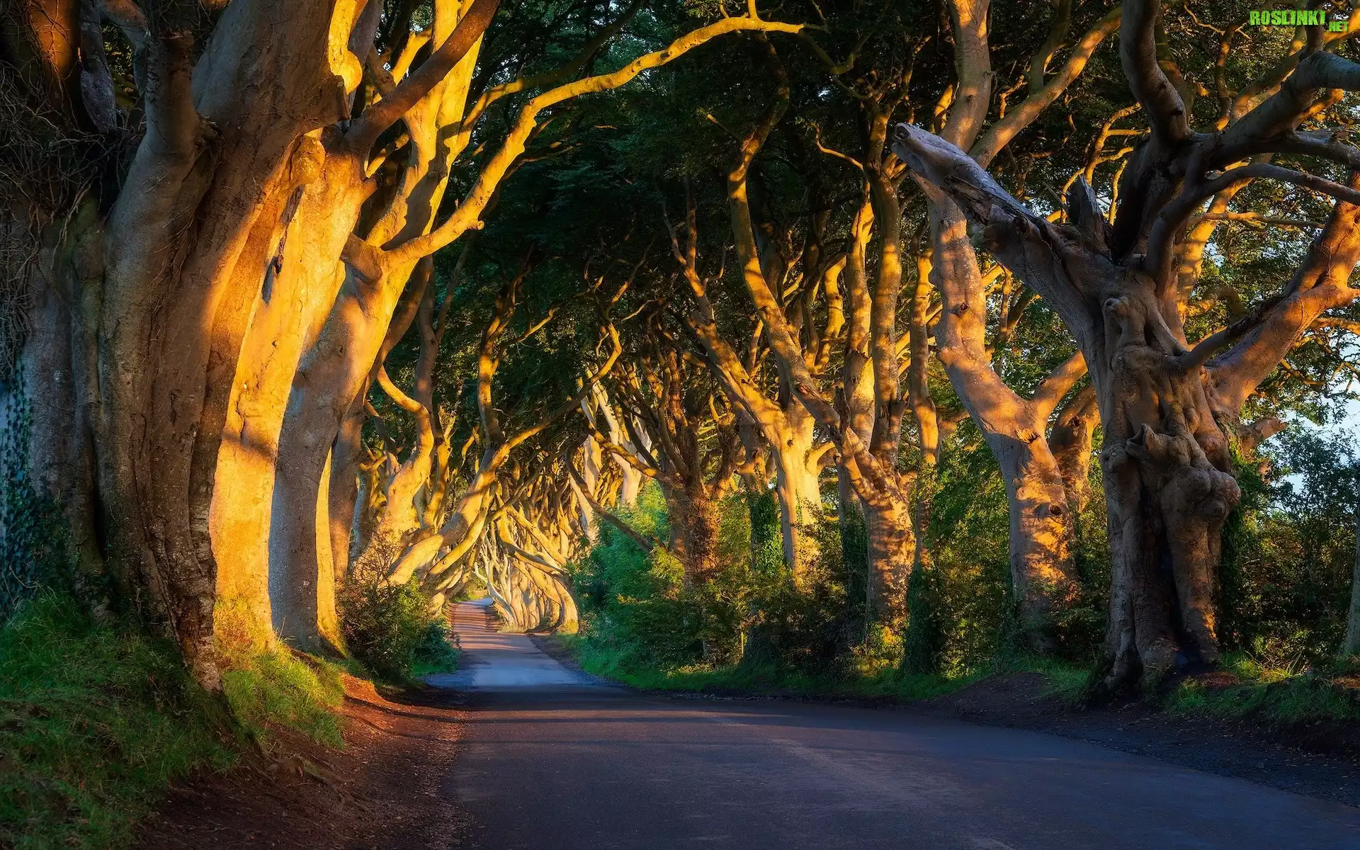 Aleja bukowa, Droga, Dark Hedges, Drzewa, Buki, Słoneczne światło, Hrabstwo Antrim, Irlandia Północna |