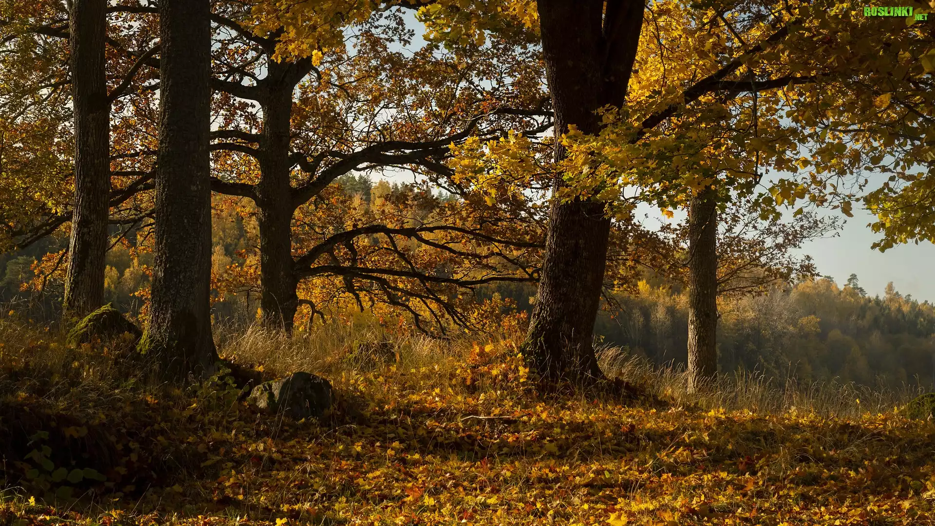 Rośliny: Jesień, Las, Drzewa, Dęby, Żółte, Liście