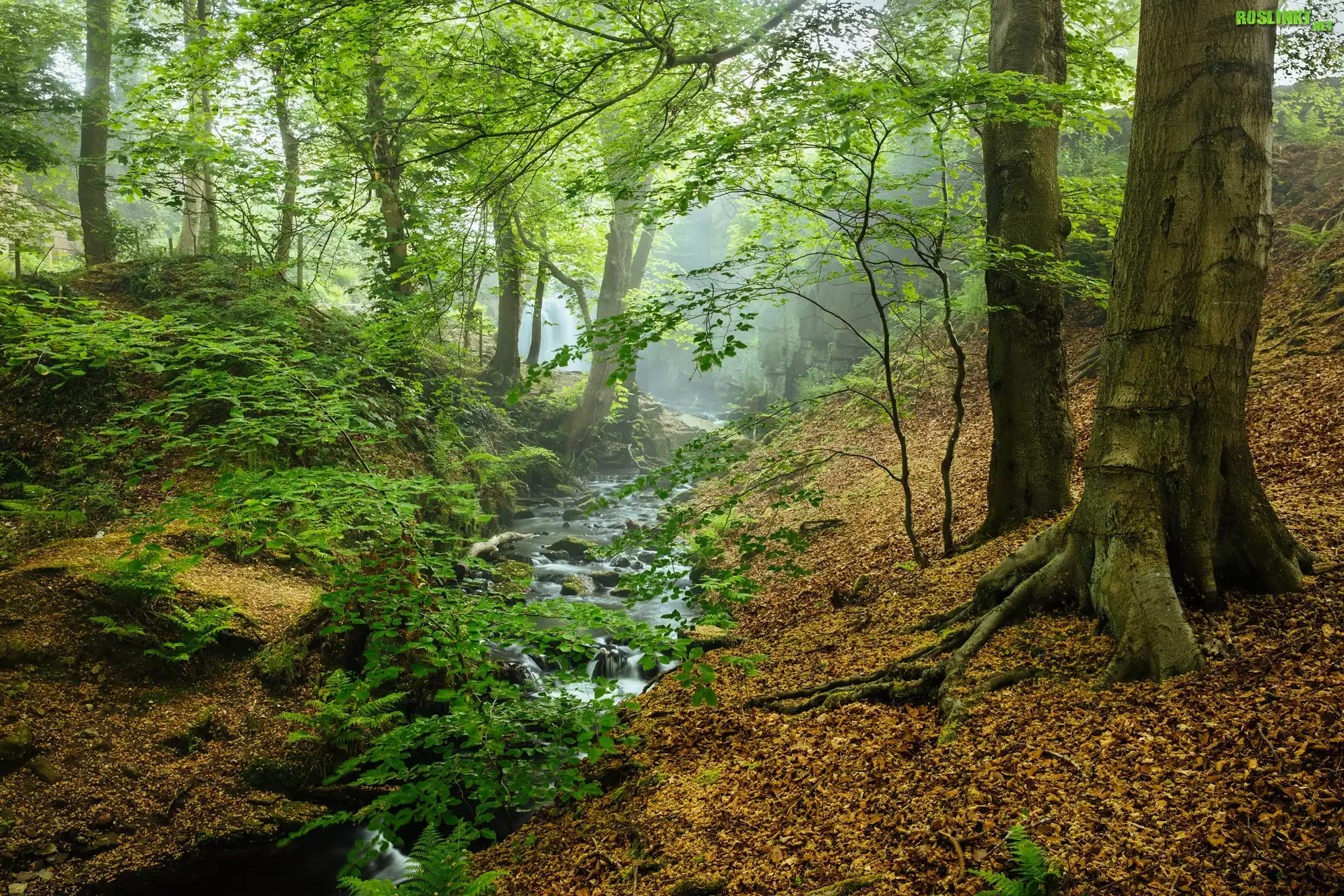 Rośliny: Anglia, Hrabstwo Derbyshire, Park Narodowy Peak District, Las, Drzewa, Strumyk, Mgła