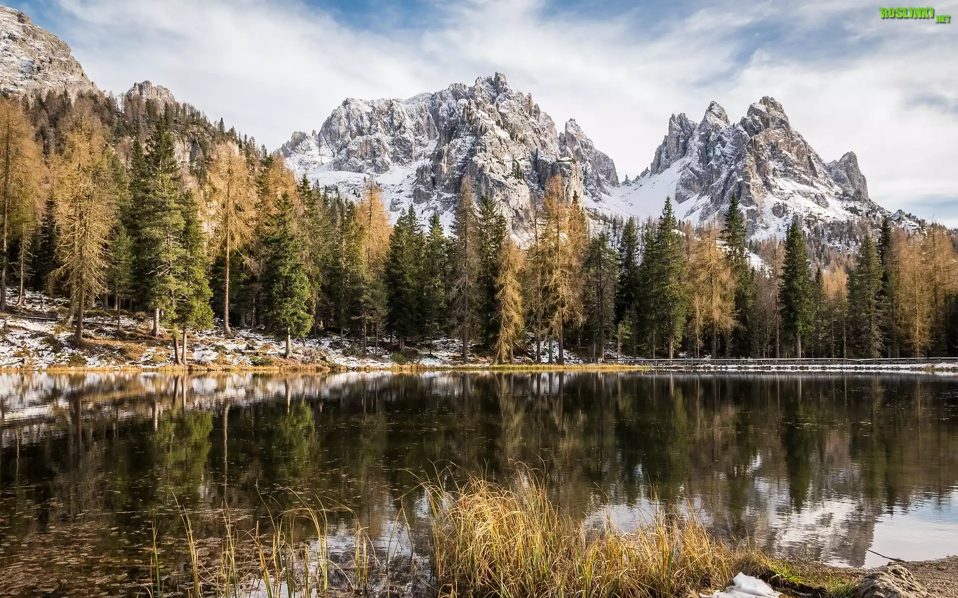 Jezioro, Antorno Lake, Góry, Dolomity, Masyw Tre Cime di Lavaredo, Drzewa, Prowincja Belluno, Włochy |