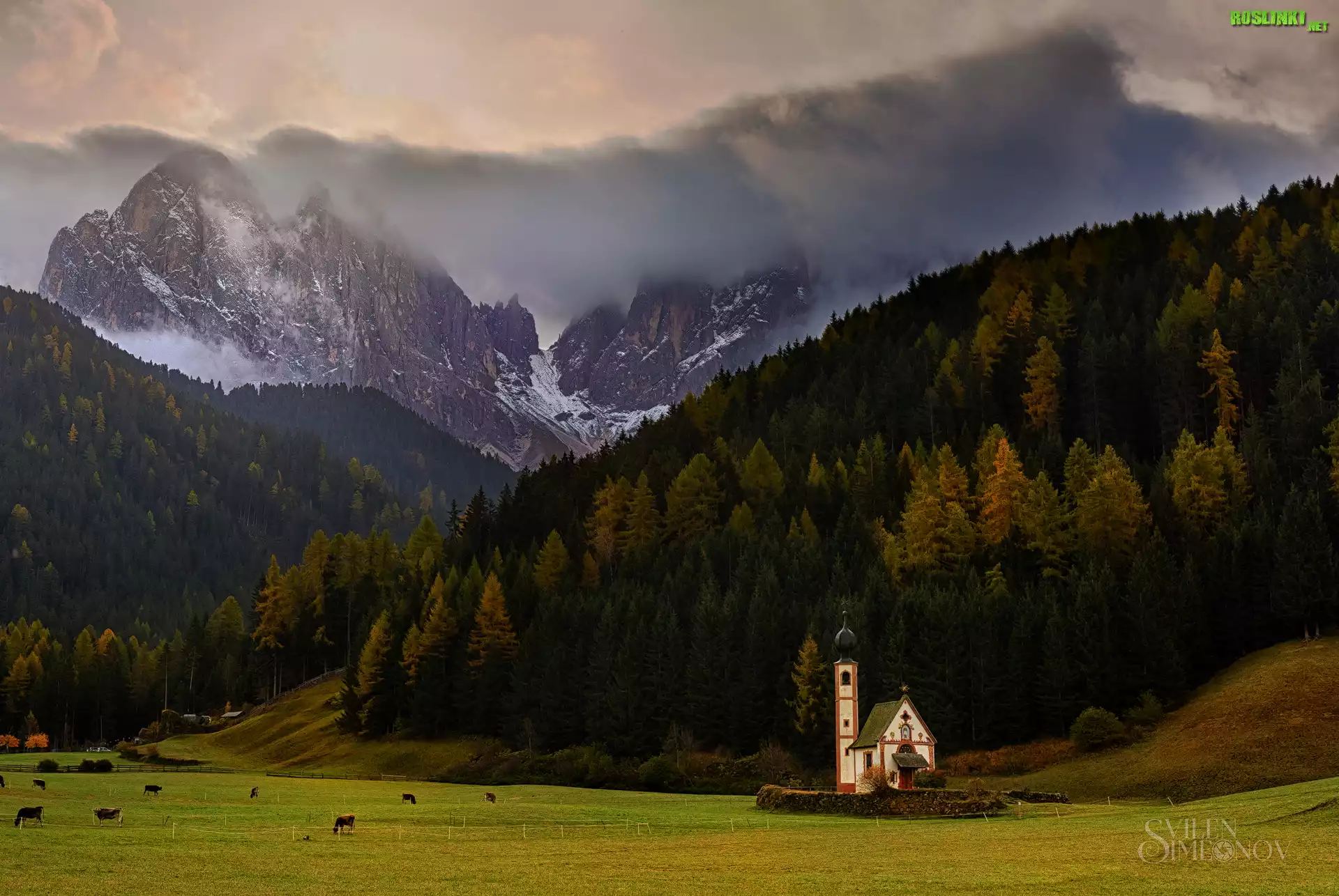 Rośliny: Dolina Val di Funes, Kościół św. Jana, Lasy, Góry, Dolomity, Włochy
