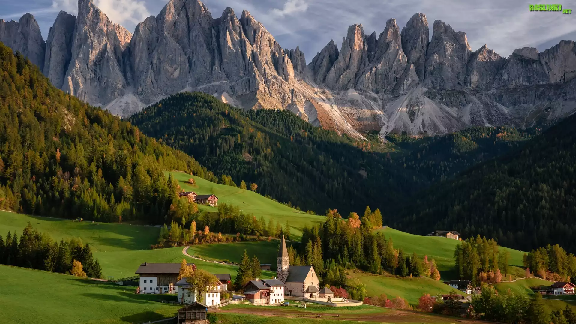 Włochy, Wieś Santa Maddalena, Dolina Val di Funes, Góry, Dolomity, Lasy, Drzewa, Domy, Kościół |
