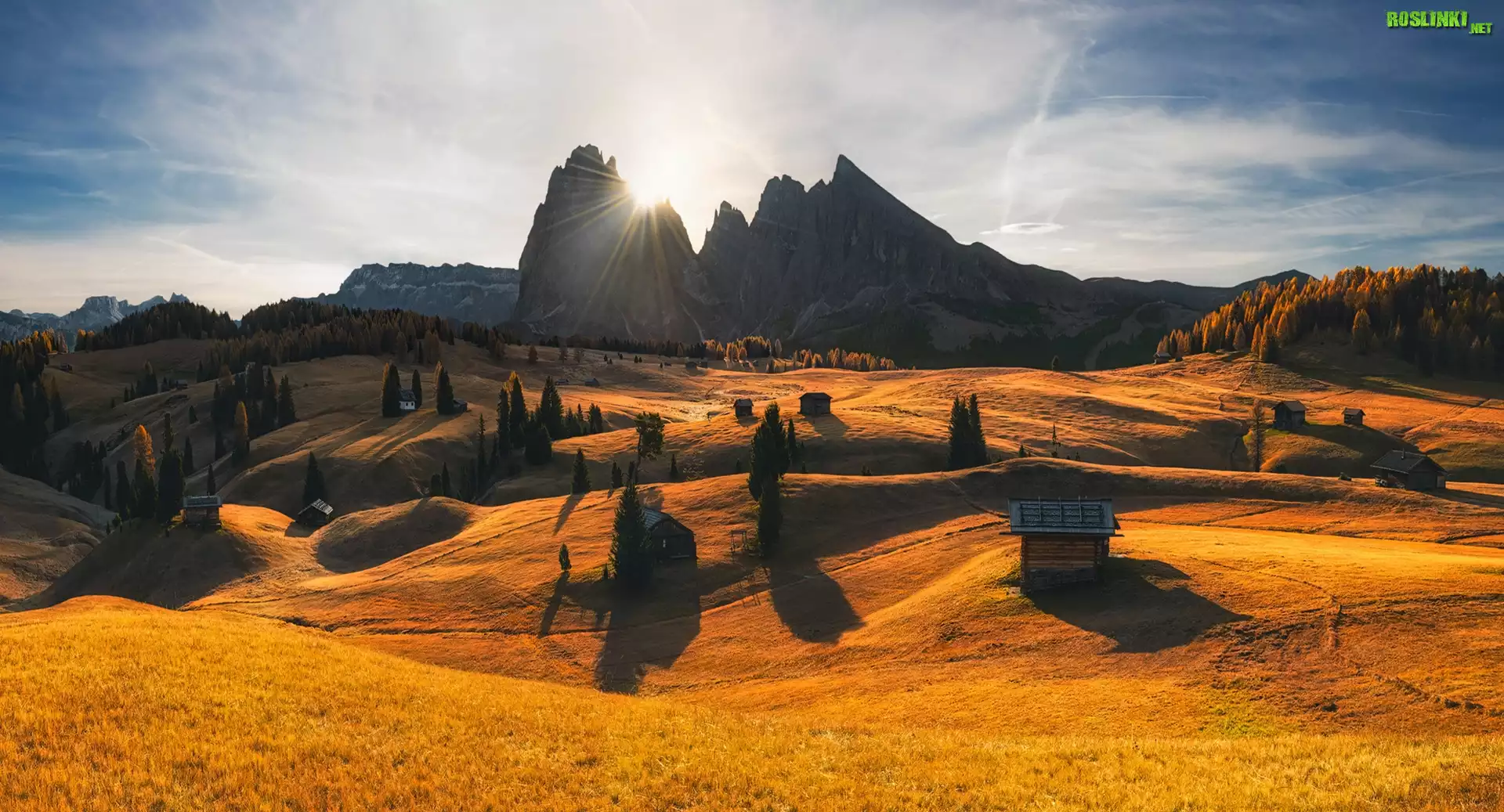 Rośliny: Dolina Val Gardena, Góry Sassolungo, Dolomity, Płaskowyż Seiser Alm, Domki, Drzewa, Włochy