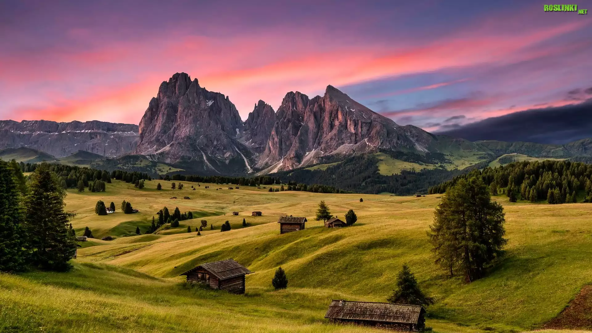 Dolomity, Góry, Sassolungo, Płaskowyż, Seiser Alm, Dolina, Val Gardena, Drzewa, Zachód słońca, Chmury, Drewniane, Domy, Włochy |