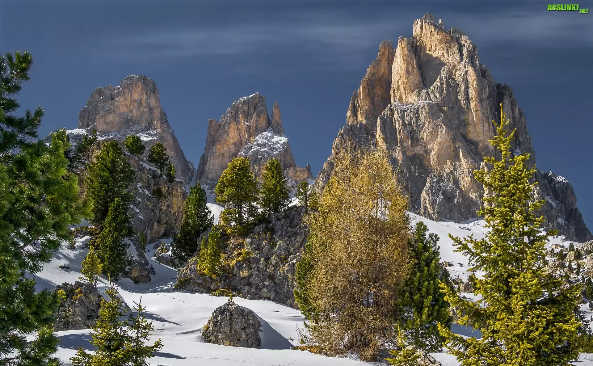 Rośliny: Góry, Dolomity, Sassolungo Langkofel, Skały, Drzewa, Śnieg, Włochy