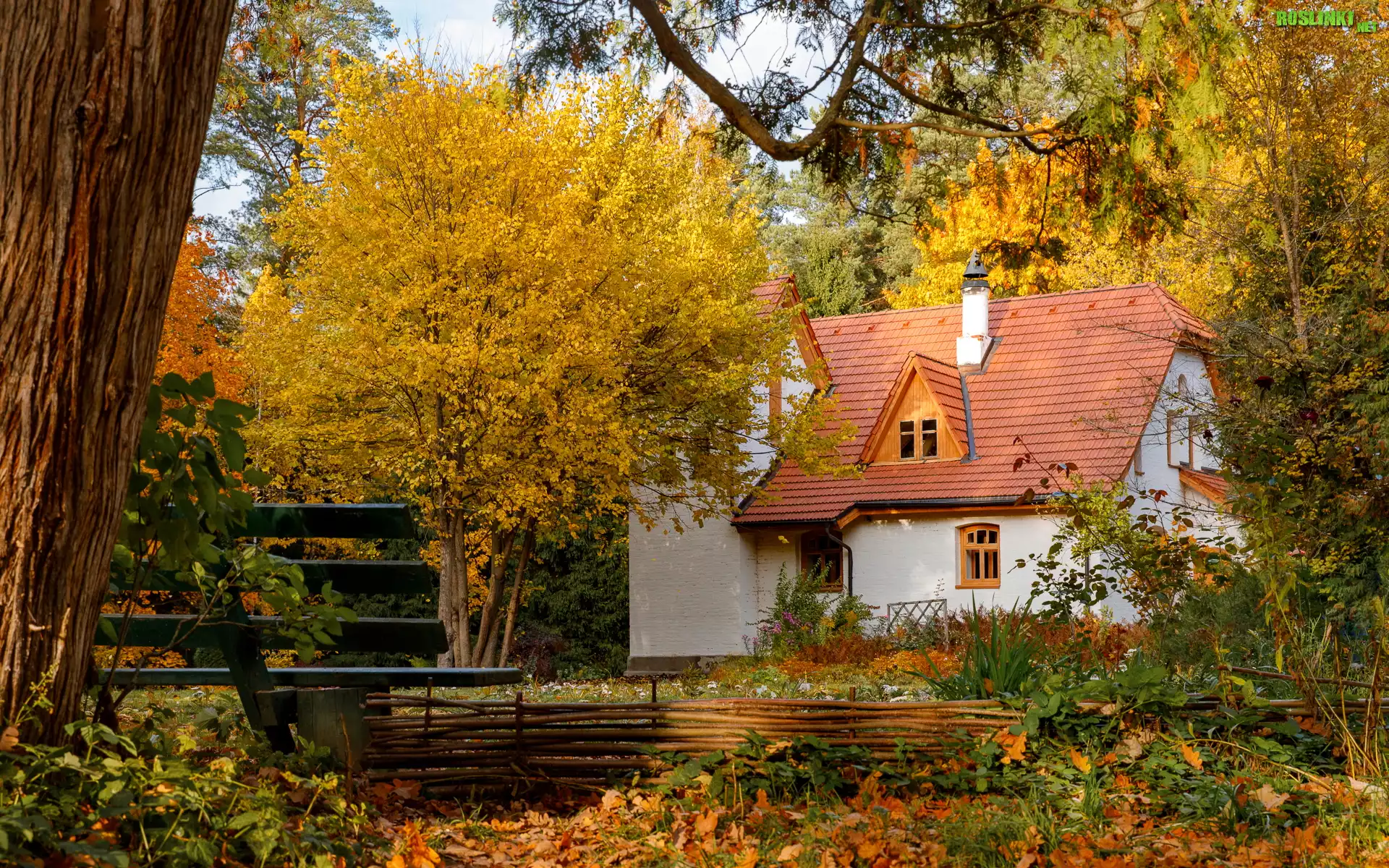 Biały, Dom, Czerwona, Dachówka, Drzewa, Ławka, Jesień
