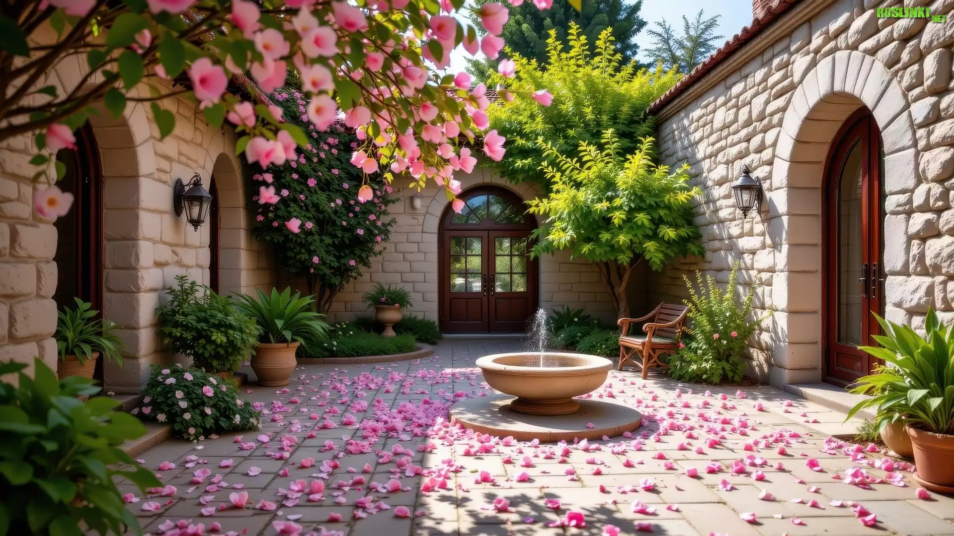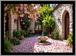 Rośliny: Dom, Kwiaty, Ozdobne, Drzewa, Fontanna, Krzesło, Płatki, Kwiatów, Dziedziniec, Rośliny