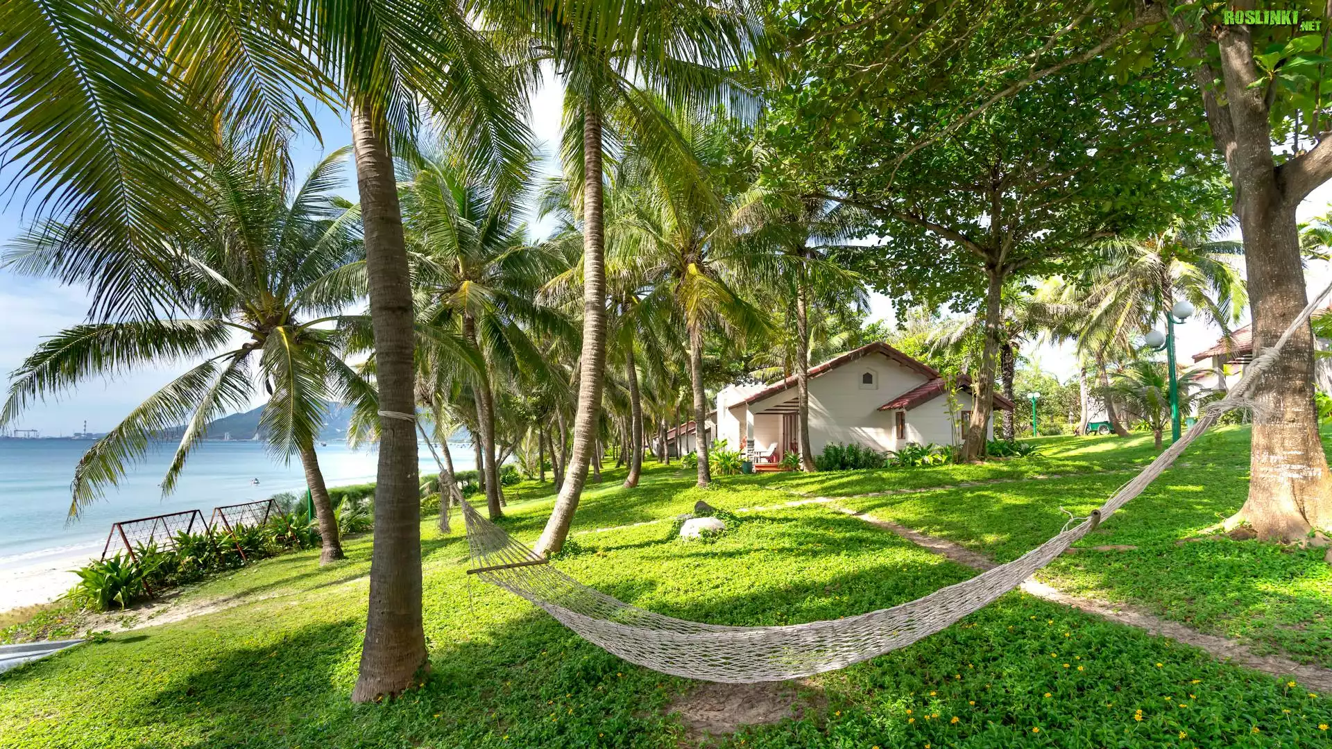 Rośliny: Hamak, Palmy, Trawnik, Dom