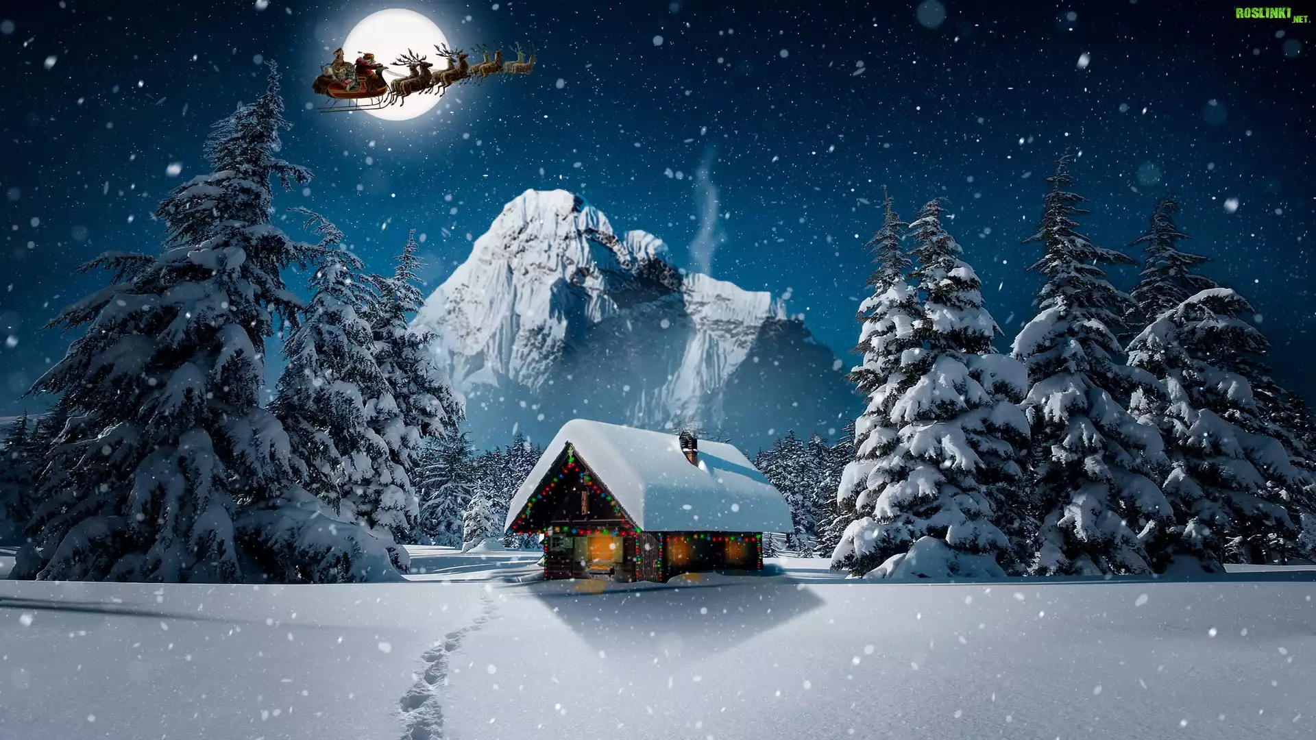 Rośliny: Mikołaj, Zaprzęg, Sanie, Renifery, Księżyc, Dom, Góry, Drzewa, Świerki, Śnieg, Zima, Grafika