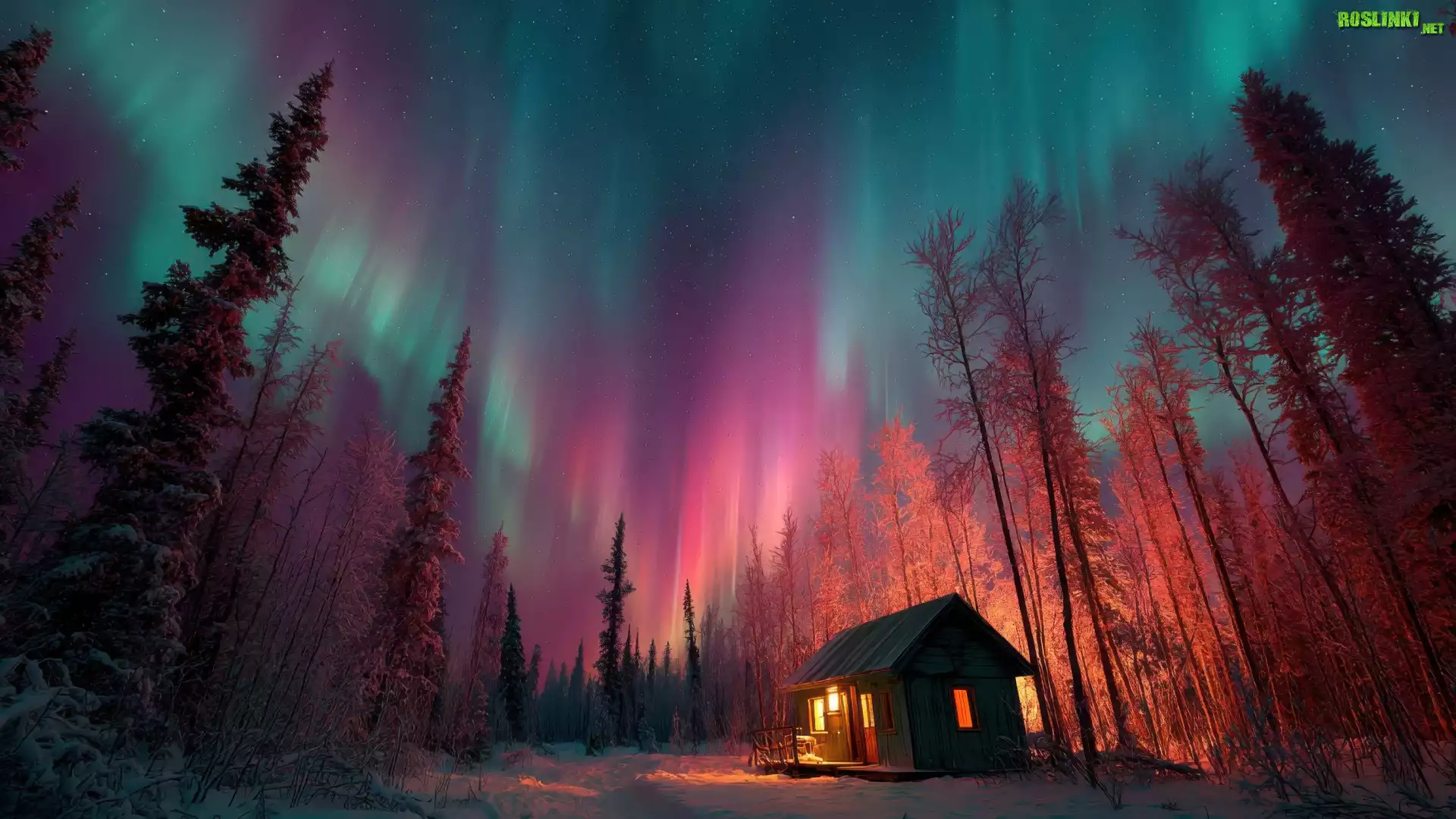 Rośliny: Zorza polarna, Noc, Zima, Ośnieżone, Drzewa, Oświetlony, Dom