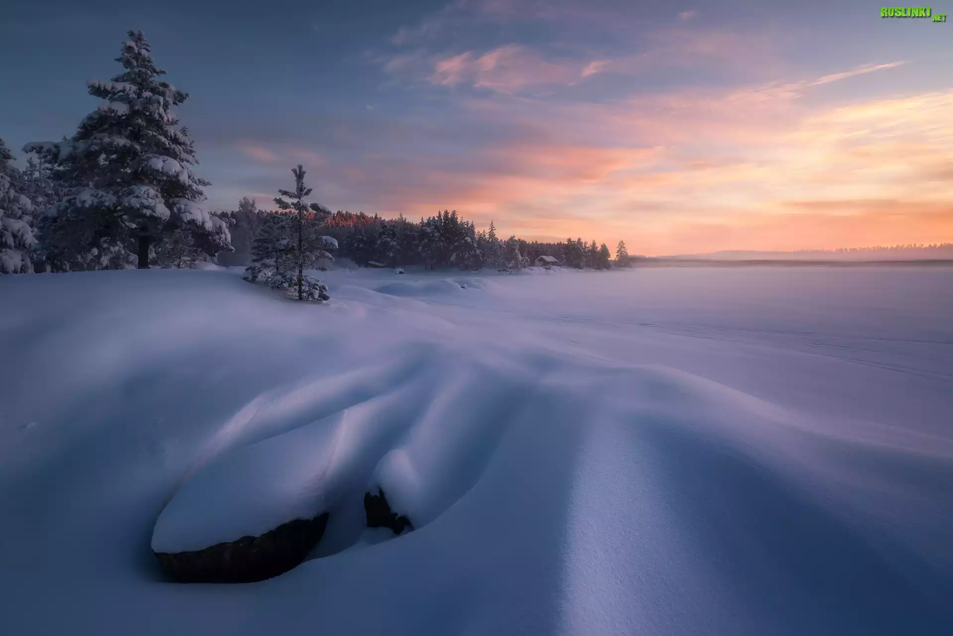 Rośliny: Zima, Las, Dom, Zachód słońca, Chmury, Zaśniezone, Jezioro, Drzewa, Ringerike, Norwegia