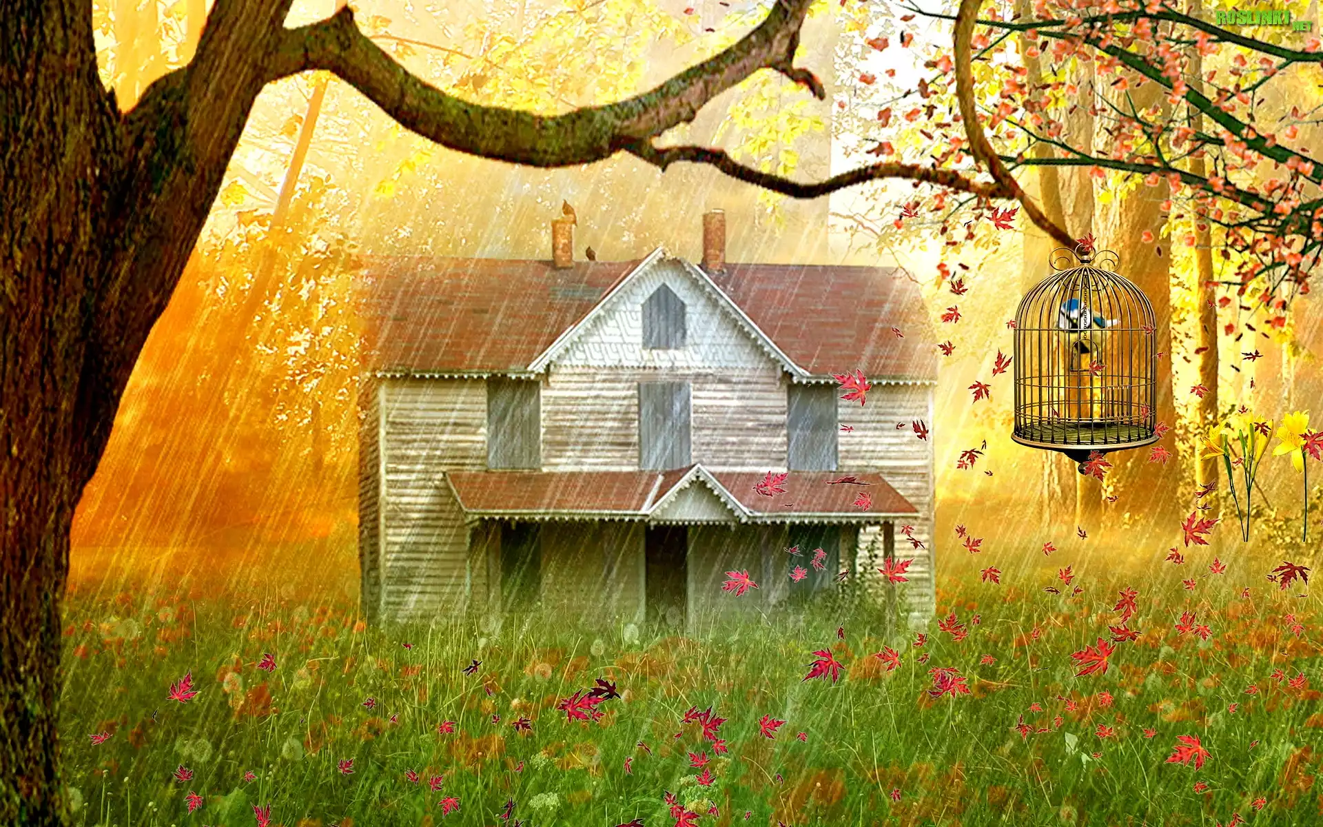 Rośliny: Domek, Drzewa, Trawa, Liście, Deszcz